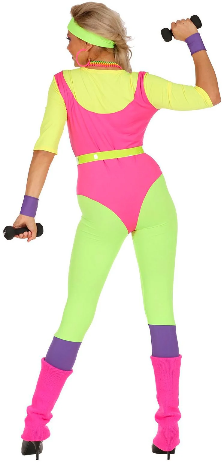 Jaren 80 Aerobics pakje voor het echte jaren 80 gevoel met neon kleuren, het pakje is zeer compleet met een jumpsuit, zweetband, polsbandjes en neon riem, een leuke pruik is los bij te bestellen en zal deze outfit helemaal compleet maken