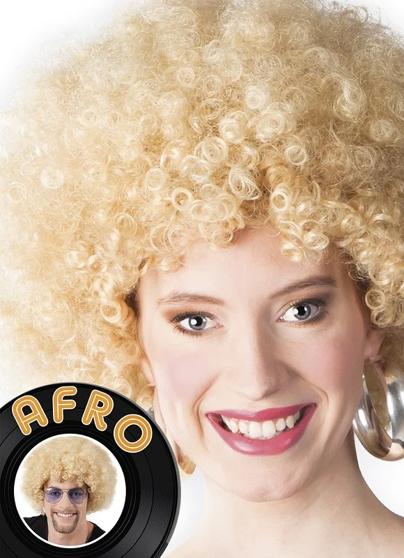 Blonde afropruik, de ideale pruik voor bij je disco outfit. In een glimmende blouse en glitterbroek naar het discofeestje, dan maakt deze blonde afropruik het helemaal af. Het is verstandig om de pruik even goed uit te schudden als deze uit de verpakking komt. We kunnen de afropruiken leveren in diverse kleuren.