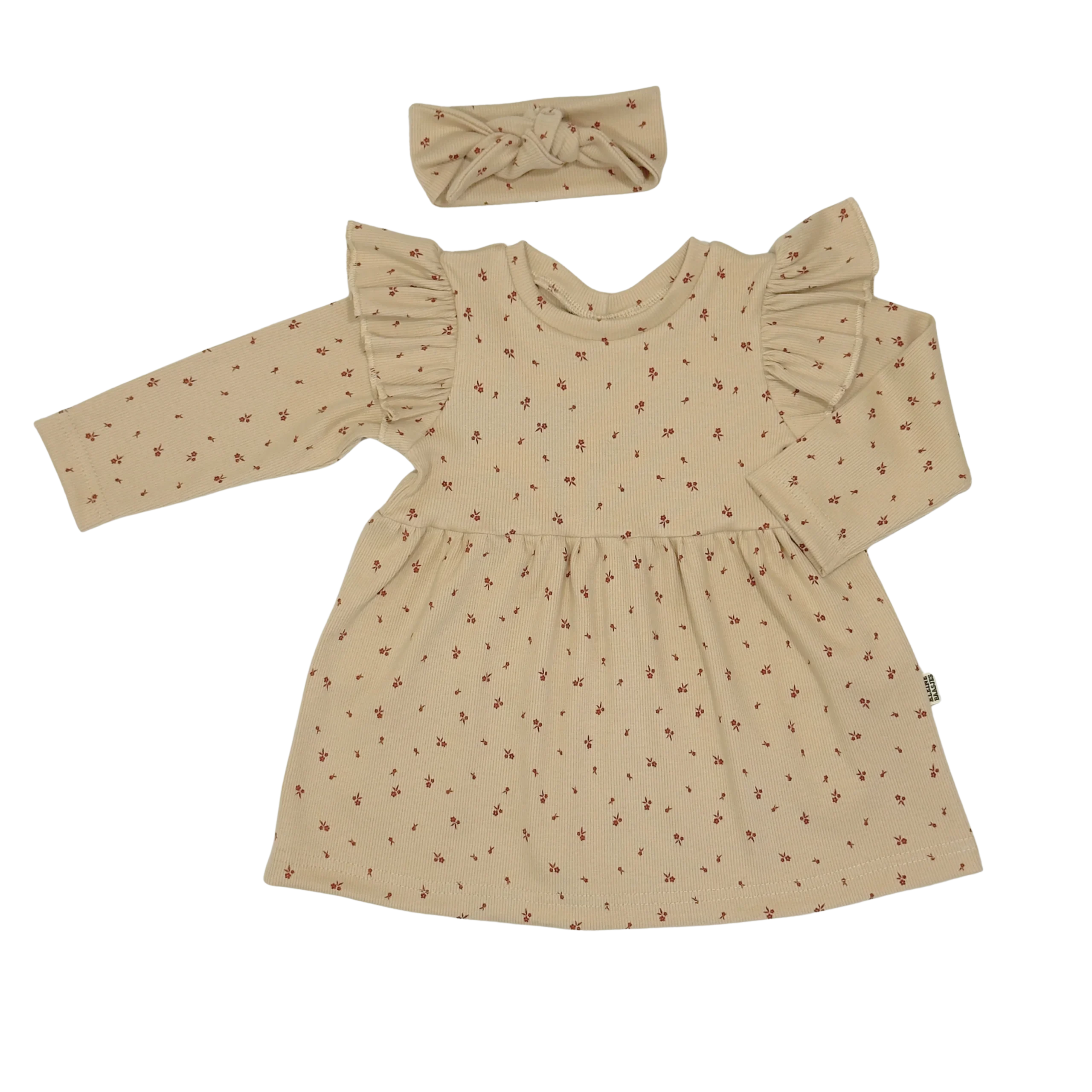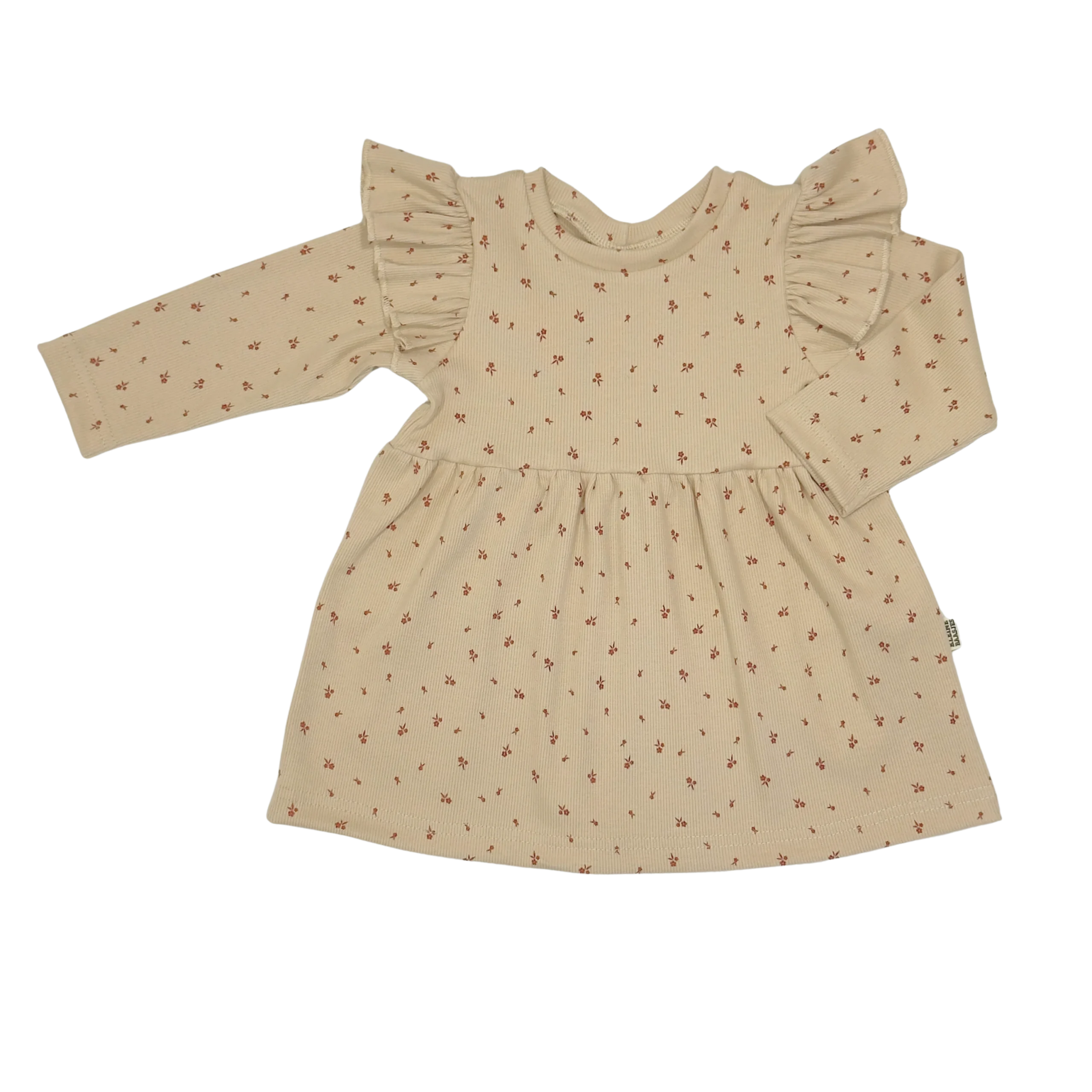 Mooie handgemaakte jurk van zachte rib stof met lange mouw en ruffles in de kleur beige. Op de beige stof zie je een printje van kleine bloemetjes in de kleur roestbruin.