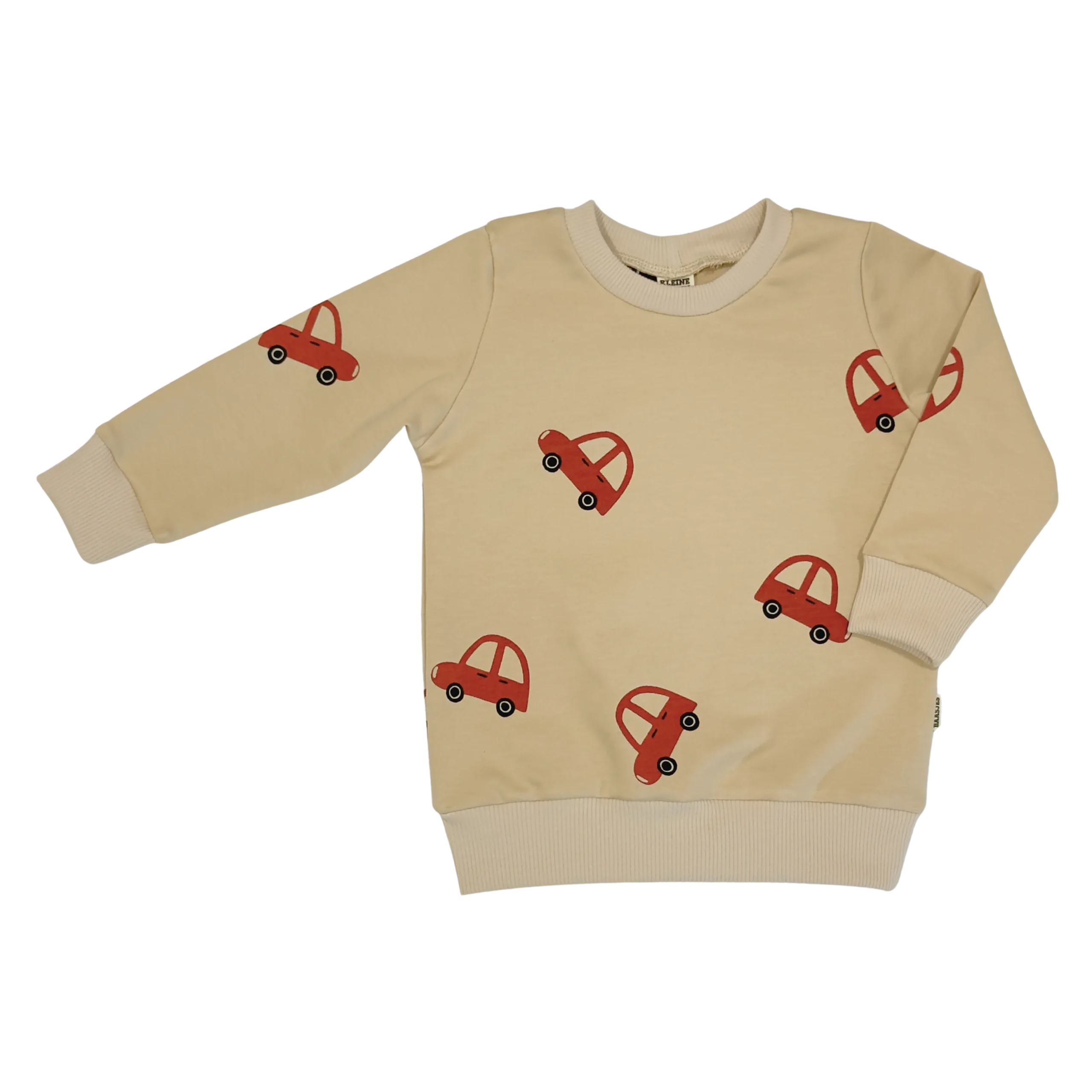 Mooie sweater van heel zacht sweat katoen in de kleur beige met een print van auto’s in de kleur roest bruin.