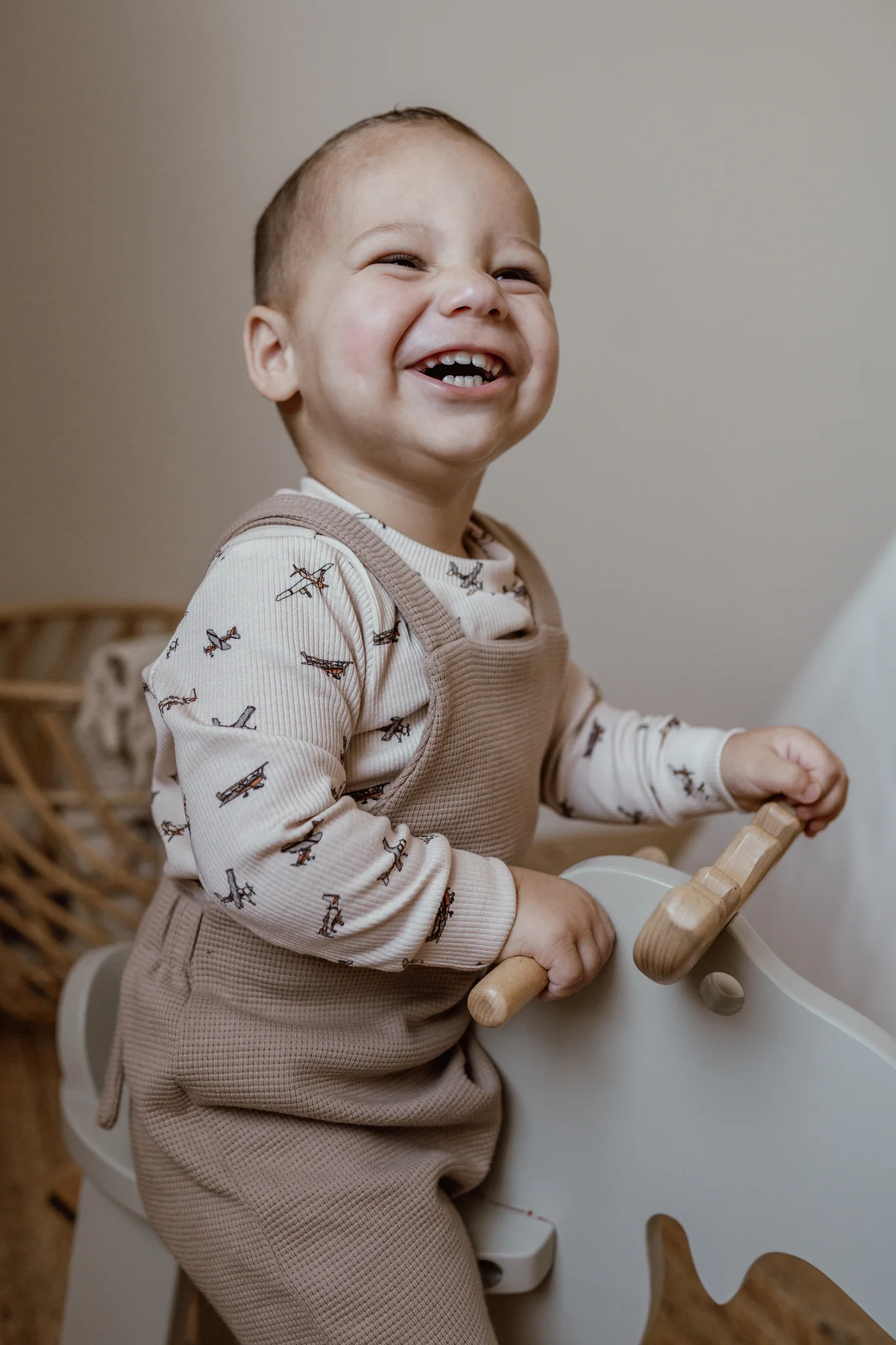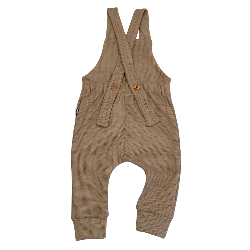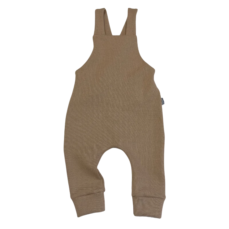 Een stoere tuinbroek (ook wel dungaree of salopette genoemd) om heerlijk in te spelen van een heel zachte wafel jersey in een mooie taupe kleur.