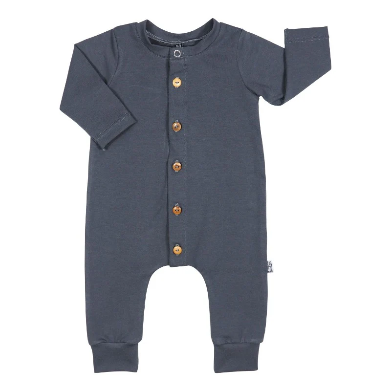 Je kunt kiezen voor drukknopen of houten knopen. De houten knopen geven de jumpsuit in combinatie met de biologische stof een mooie en natuurlijke look. De metalen drukkers zijn voordeliger en makkelijker met aankleden.