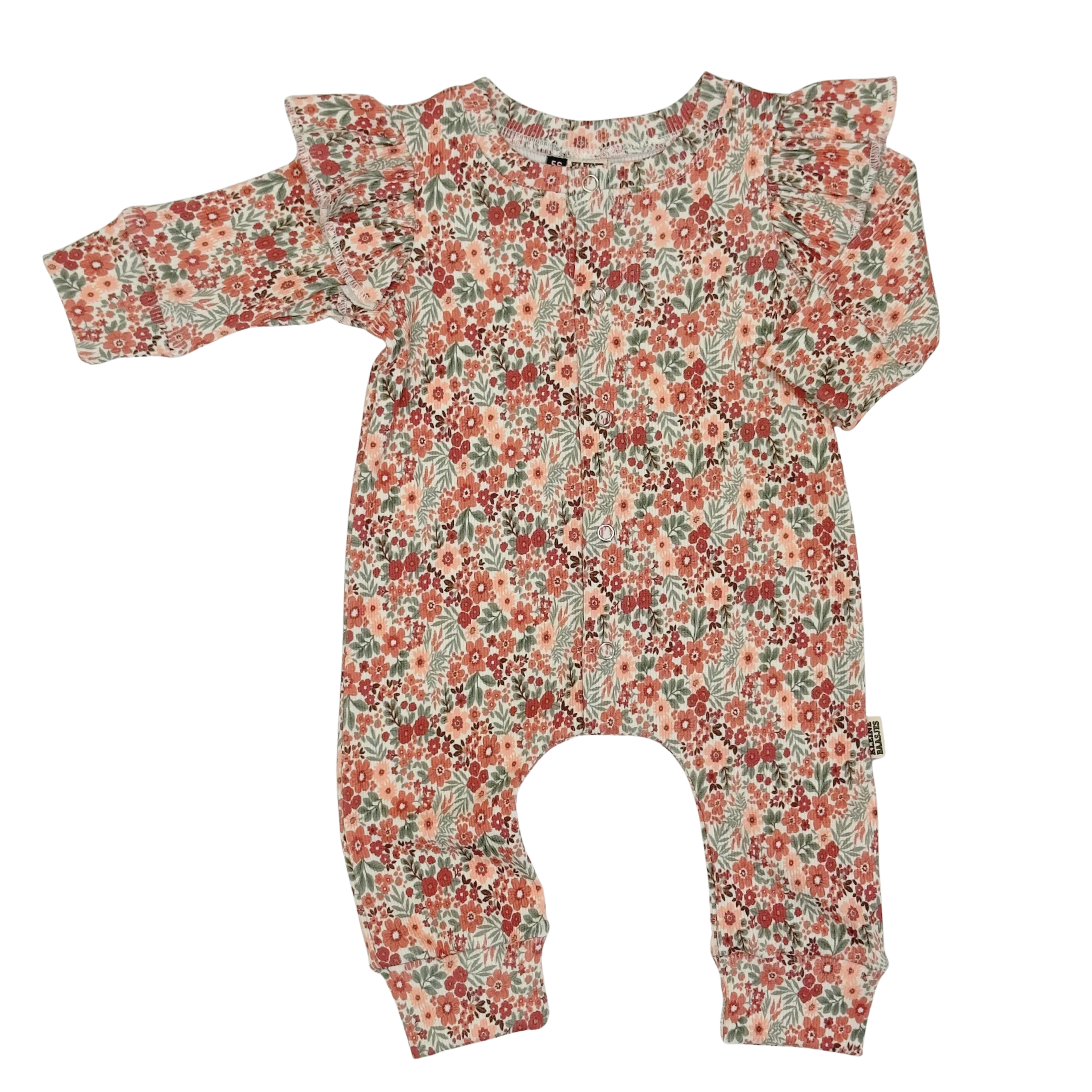 Mooie baby jumpsuit met ruffle mouwtjes van zachte ribstof met een lief printje van kleine bloemetjes die je aan herfst doen denken in de kleuren roze, groen en roest.
