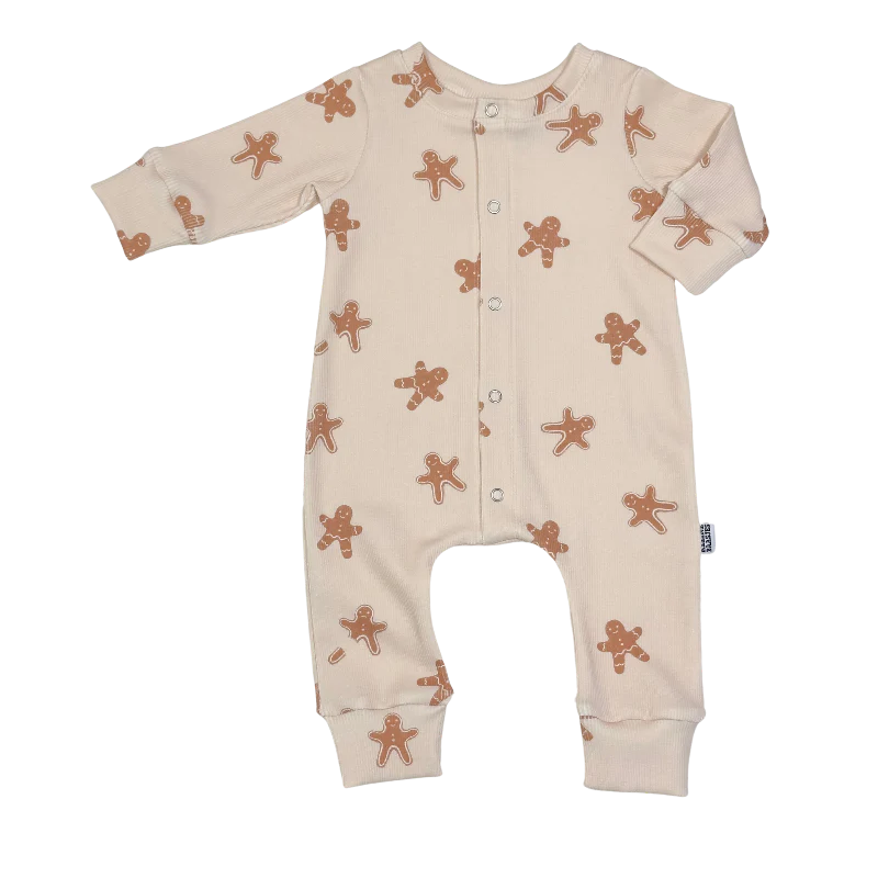 Mooie jumpsuit van zachte ribstof met een print van vrolijke peperkoekmannetjes op een creme/wit kleurige achtergrond.