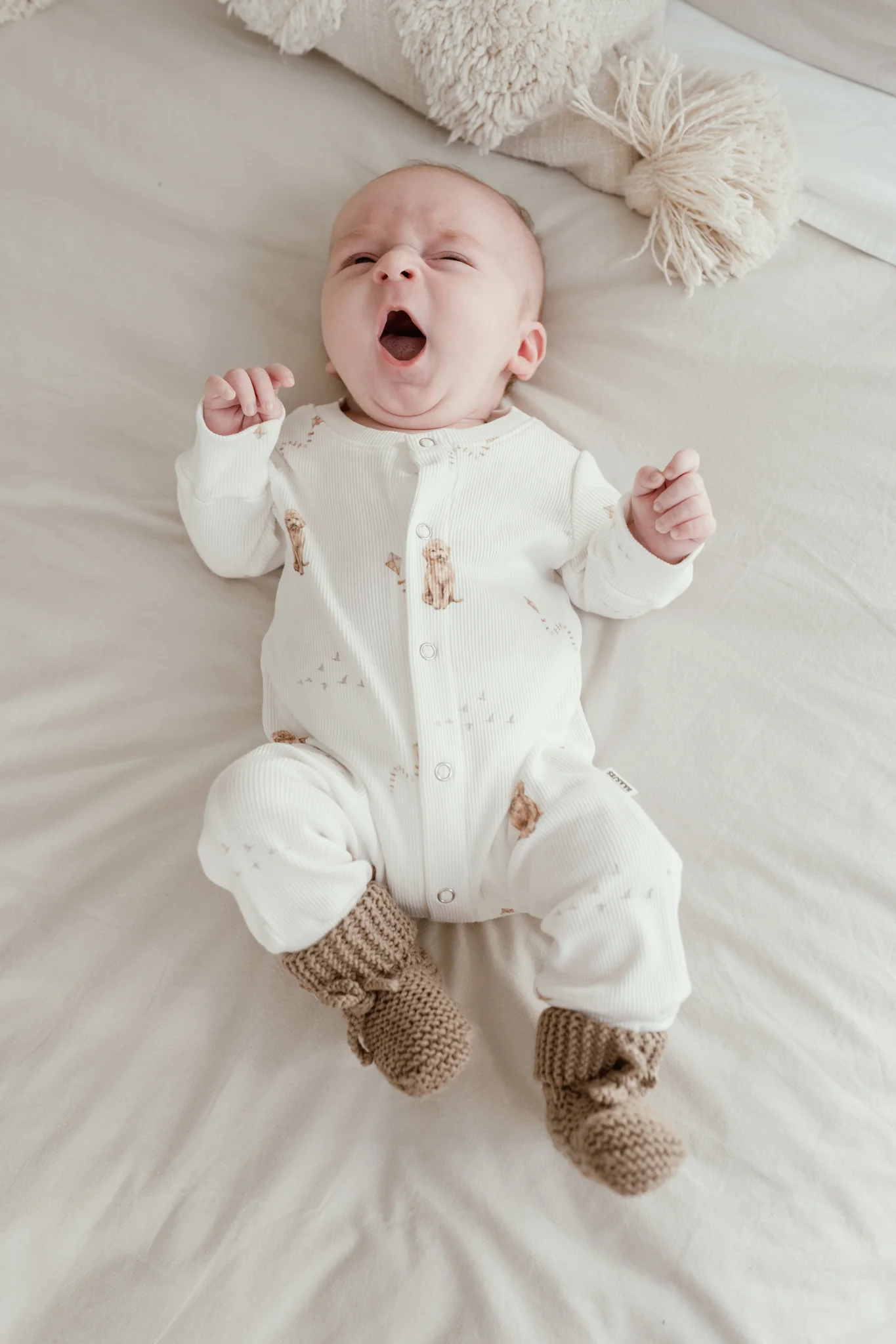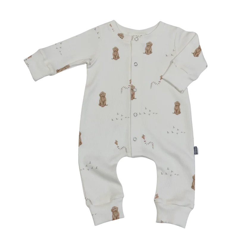 Mooie jumpsuit in een zeer zachte ribstof met een lieve print van labradoodle hondjes in de kleur crème/wit.