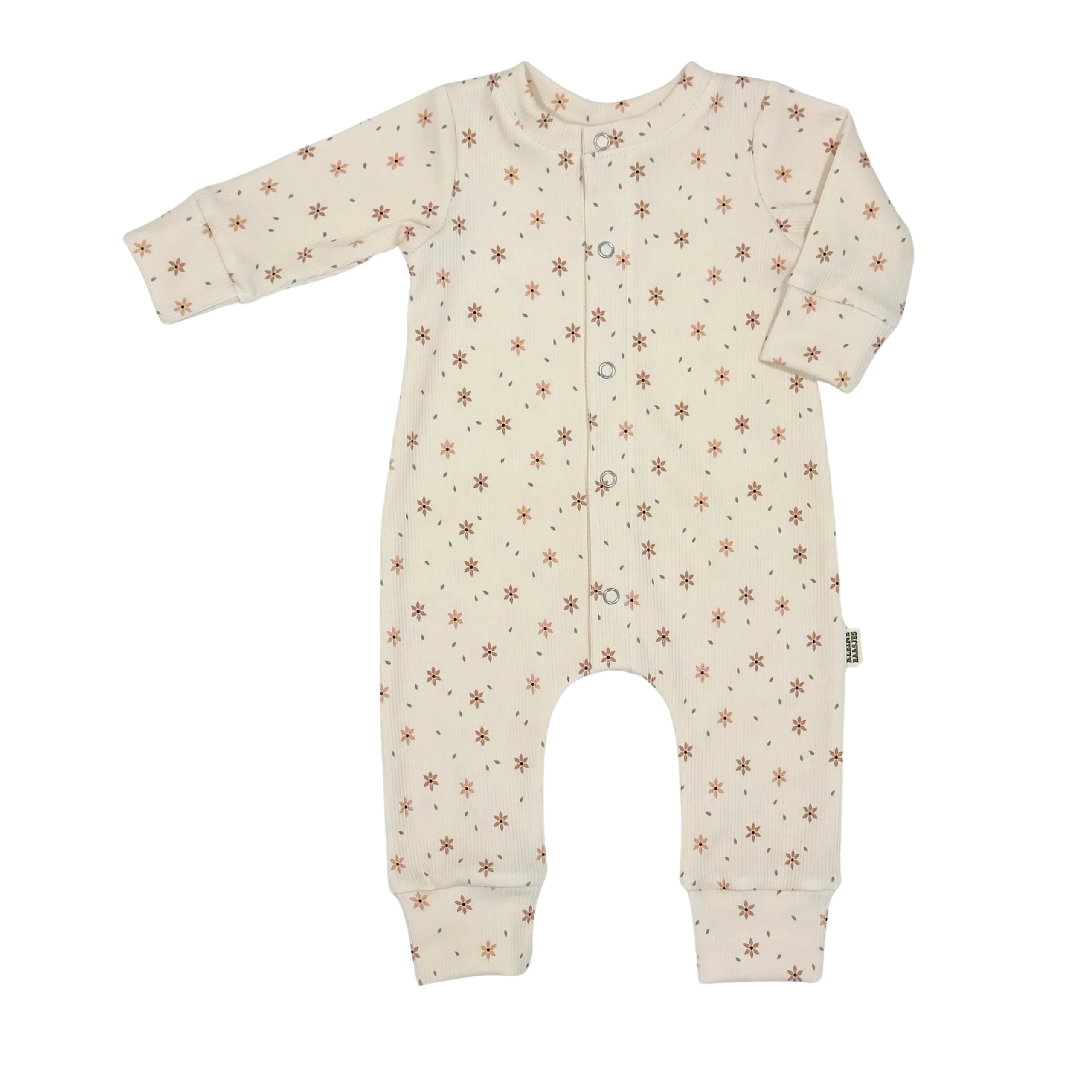 Mooie baby jumpsuit van zachte ribstof met een print van kleine stervormige bloemetjes in de kleur creme. De subtiele print van kleine bloemetjes zijn beige en bruin(camel) van kleur met kleine groene blaadjes.