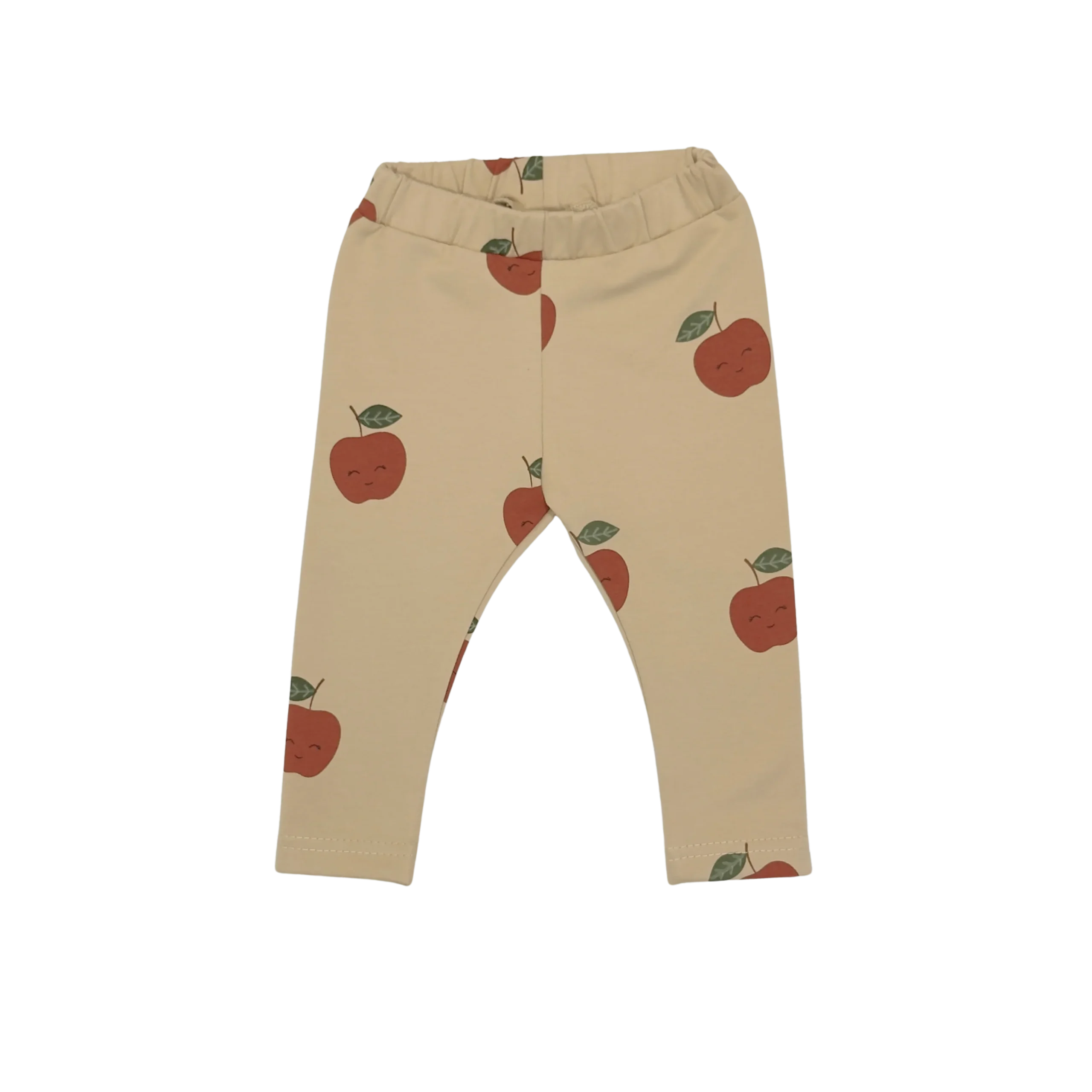Deze babylegging heeft een leuke appel print met kleine gezichtjes op de appels. De achtergrond kleur van de legging is beige. De kleuren van de appels zijn roest/rood en groen.
