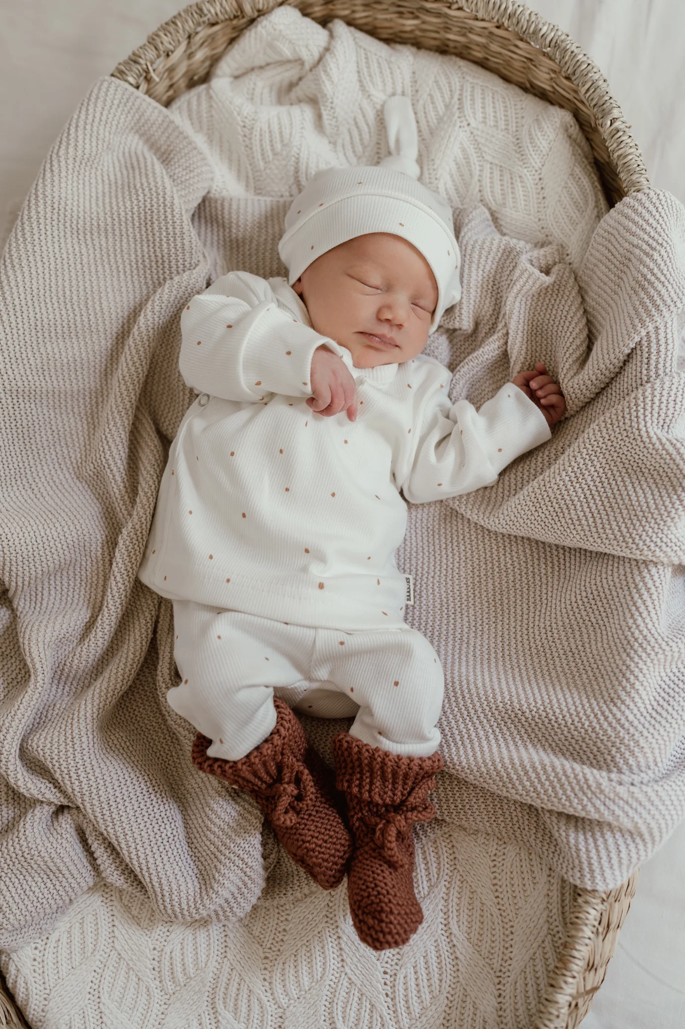Dit baby broekje met bruine stipjes is perfect in combinatie met de andere items van deze newborn serie of combineer met een overslag vestje in een andere bruin tint zoals het camel overslag vestje.