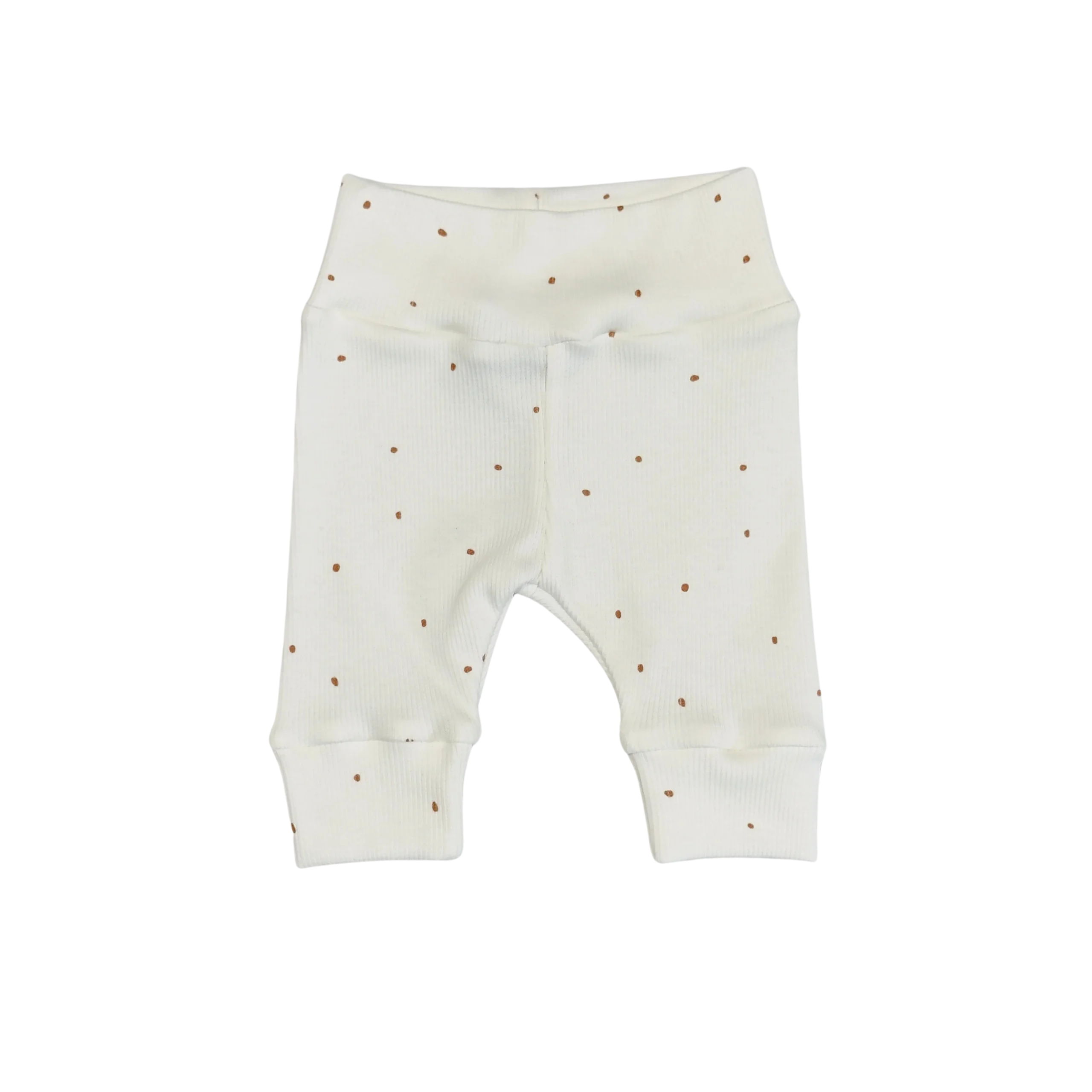Fijn neutraal newborn broekje van een zeer zachte rib jersey stof. Het baby broekje is creme van kleur en heeft kleine bruine stipjes als print.