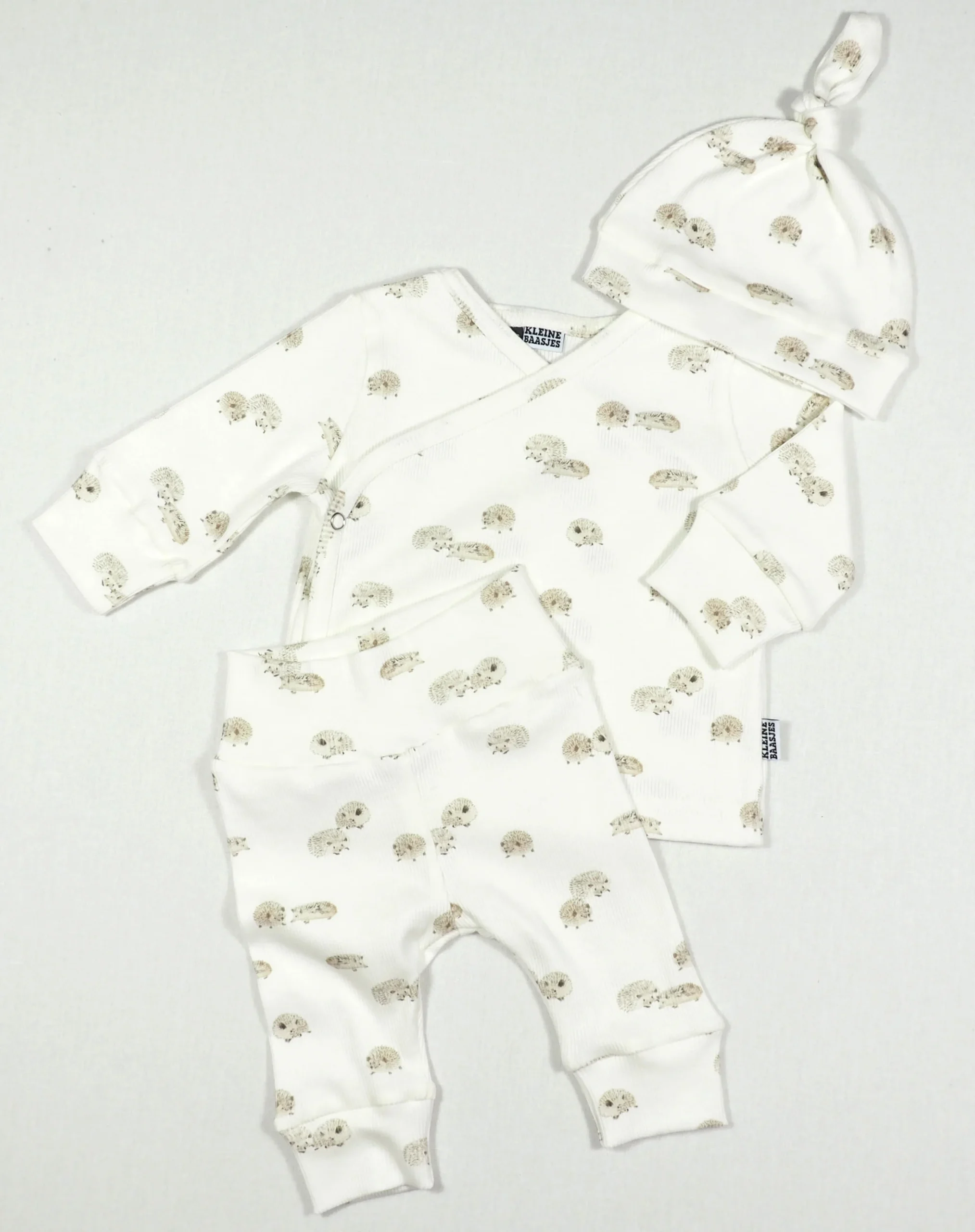 Fijn neutraal newborn baby broekje van een zeer zachte rib jersey stof in een schattige egel print.