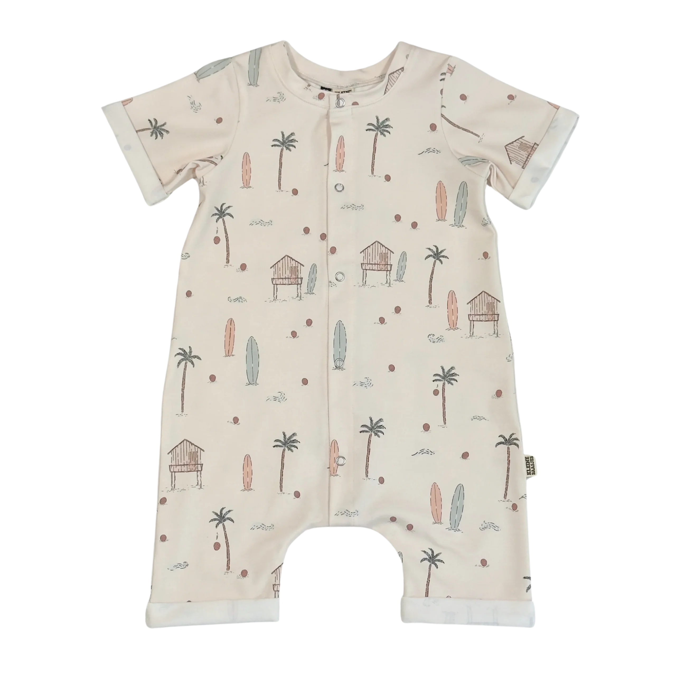 Mooie zomer jumpsuit in een zachte jersey met een printje van vrolijke strand dingen zoals palmbomen, surfplanken en strandhuisjes. Het pakje heeft de kleur creme met de print in zachte pastel tinten.