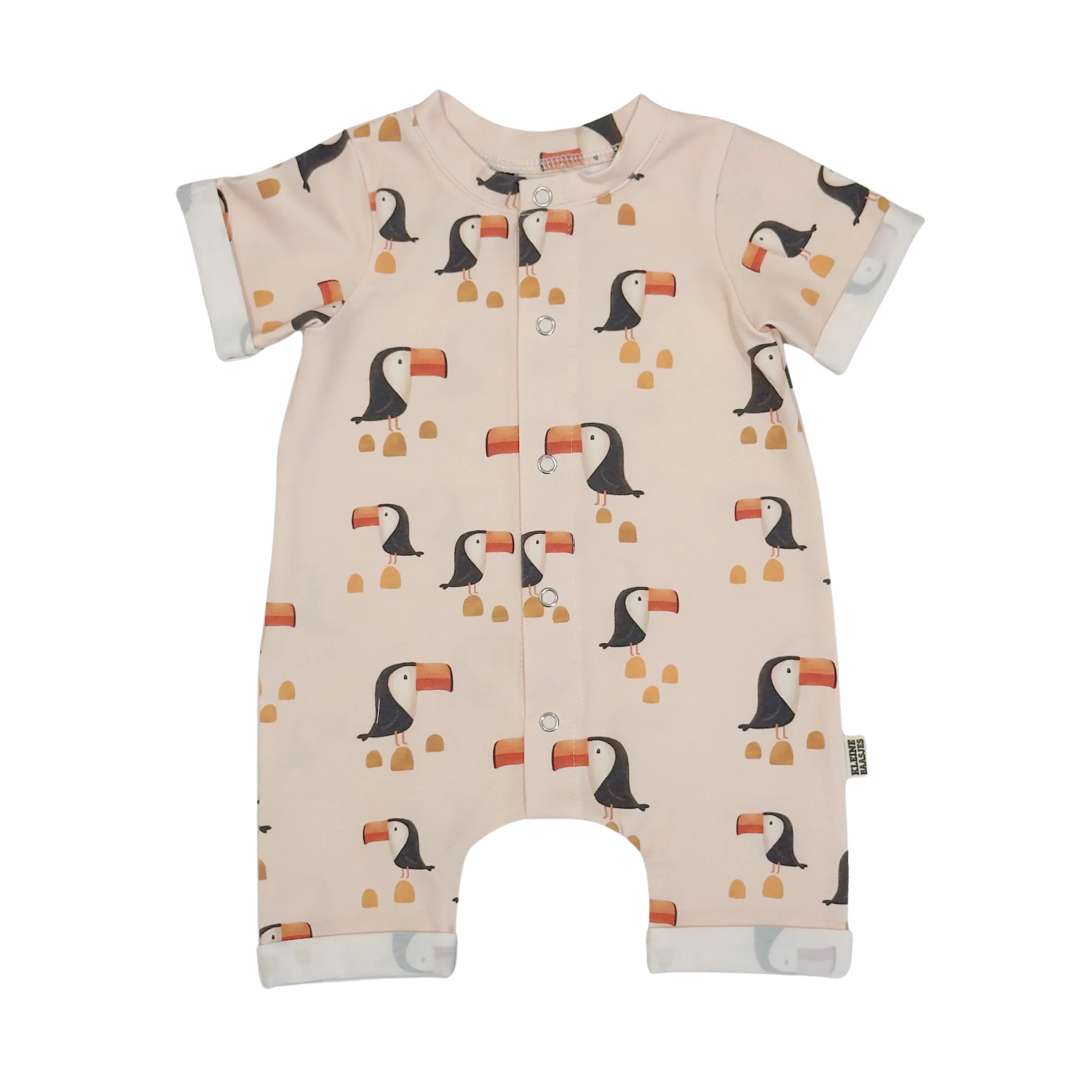 De jumpsuit heeft beige achtergrond. Op de print zie je toekans in zwart, wit, oranje en oker.
