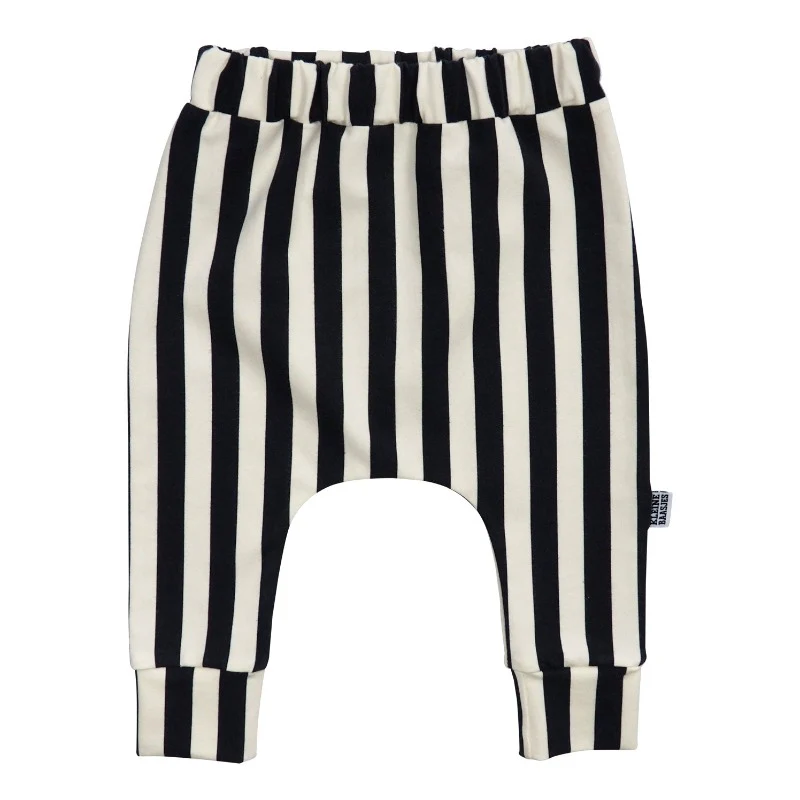 Fijn broekje van zachte jersey met een verticale streep in de kleuren zwart en creme. het broekje heeft een baggy model en aansluitende boorden bij de enkels die niet te strak zitten.
