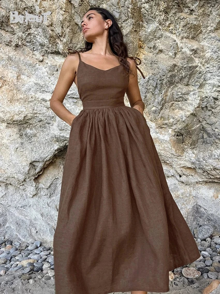 Bruine Linnen Midi Jurk met Spaghettibandjes
