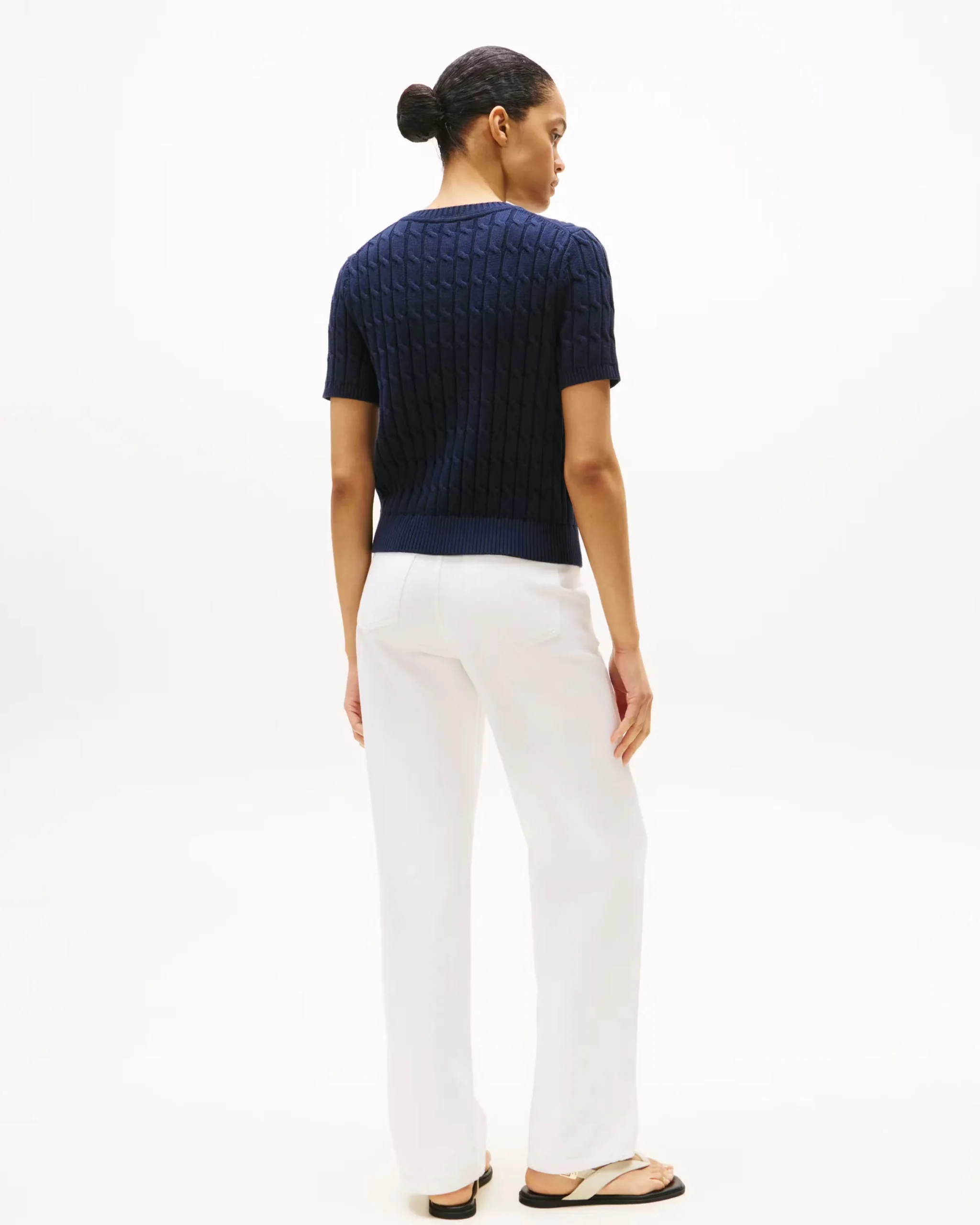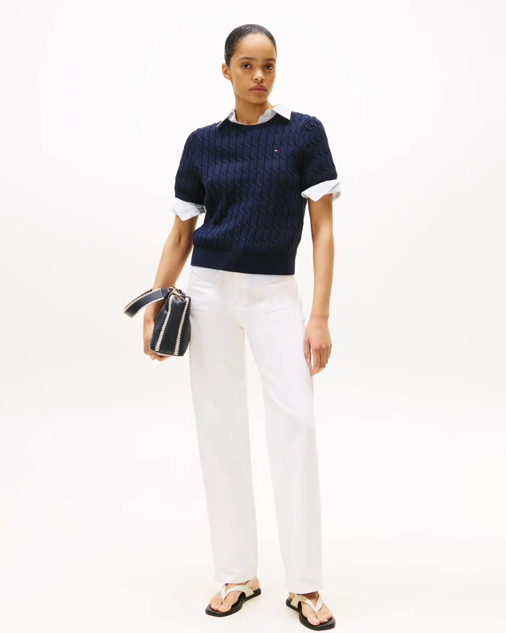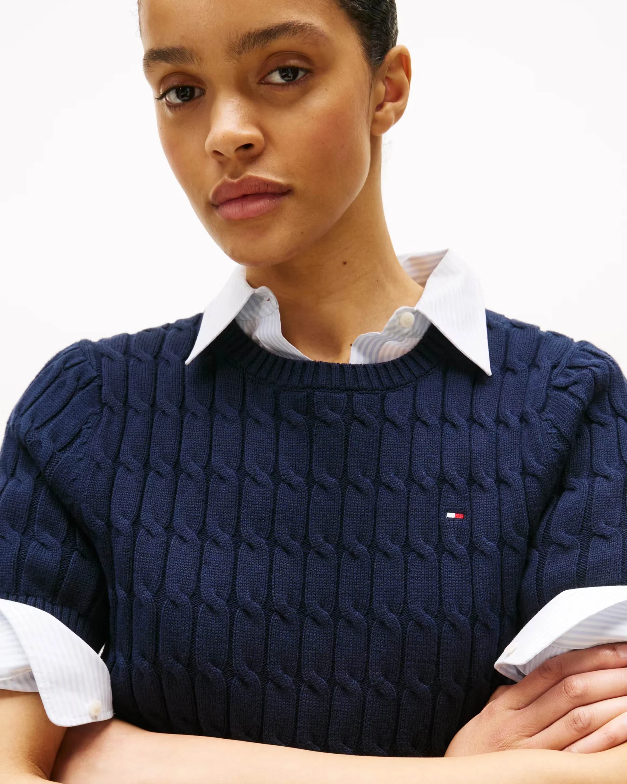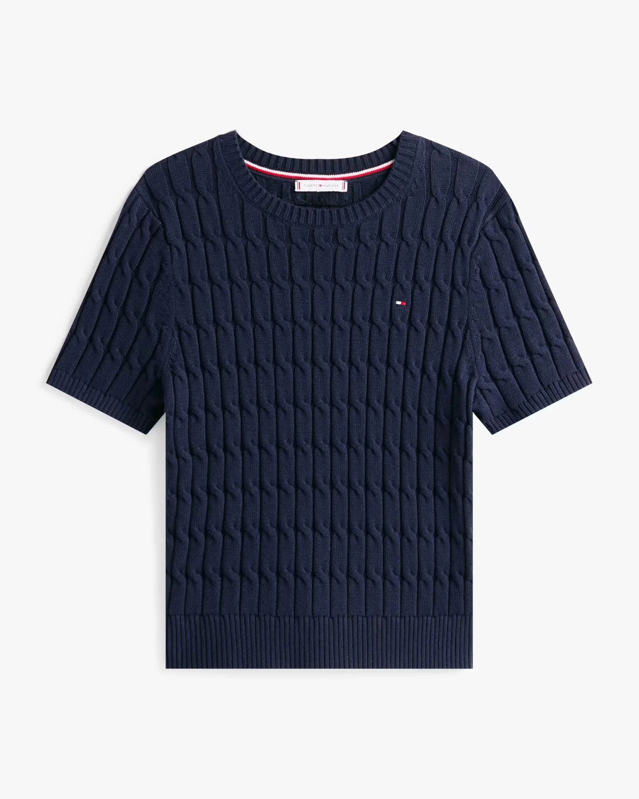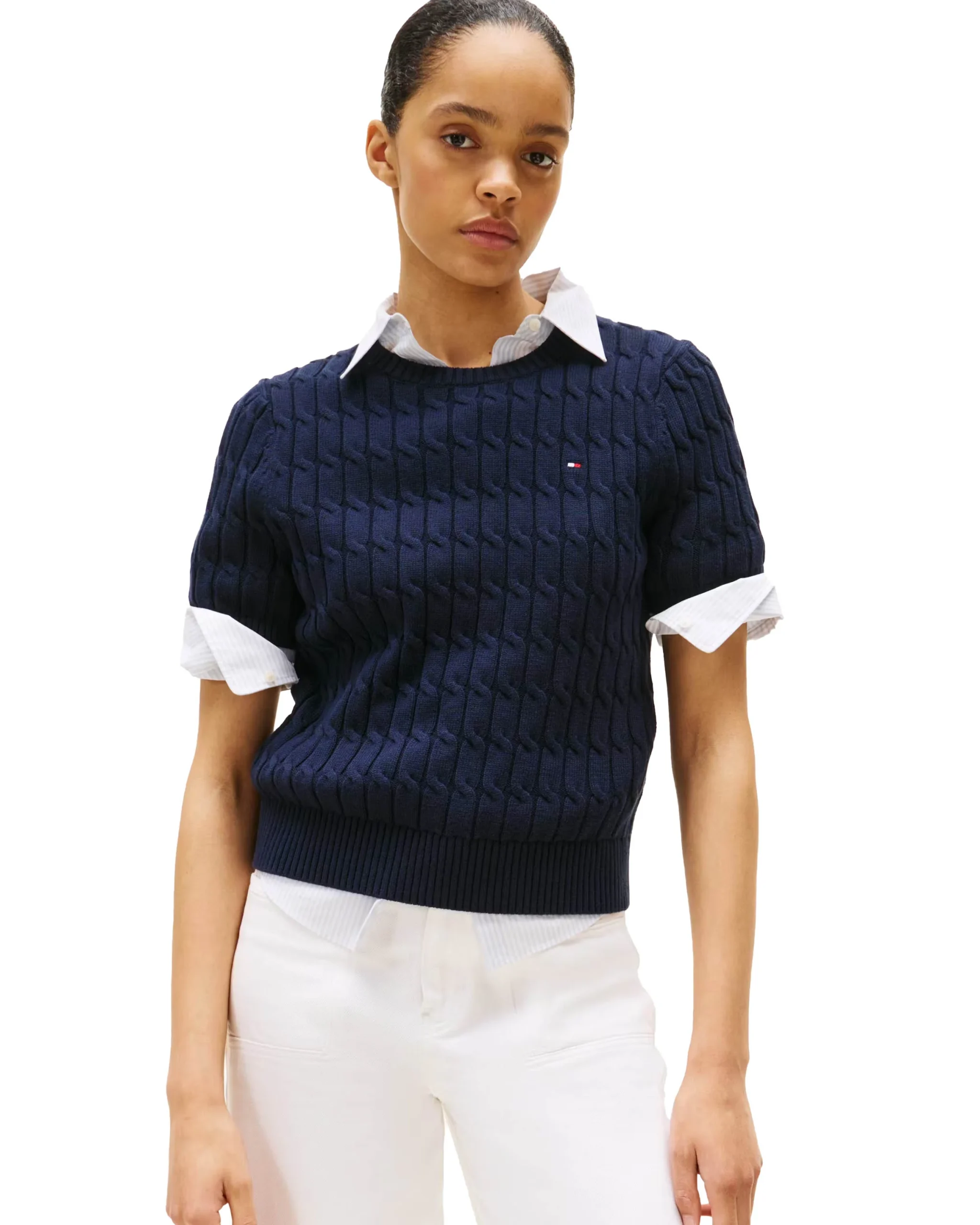 Maak kennis met de Cable Crewneck Korte Mouwen, een verfijnde keuze voor de moderne vrouw. Het luxueuze breisel en de navy kleur voegen direct stijl toe aan elke garderobe, terwijl het iconische merk zijn kwaliteitsstempel drukt. Deze trui is zowel comfortabel als elegant, perfect voor diverse gelegenheden. De tijdloze kabelstructuur biedt een interessante textuur en maakt het item veelzijdig in combinatie. Laat jouw persoonlijkheid stralen met dit stijlvolle stuk dat klasse en comfort verenigt.