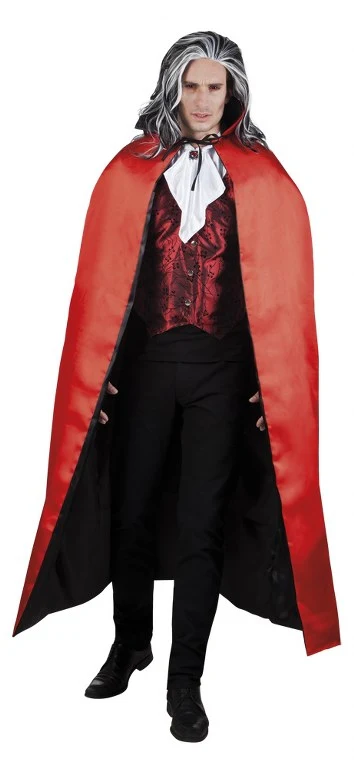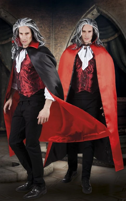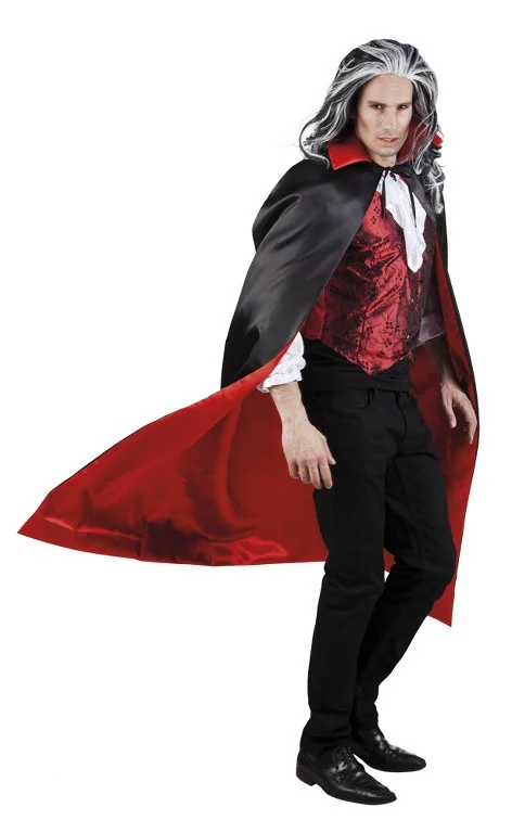 Vampier Cape Rood-Zwart omkeerbaar, de Dracula-Cape of Vampier Cape is aan twee zijden te dragen, zwart of rood. Bij deze cape is het raadzaam om een paar Vampiertanden bij te bestellen of een flesje bloed. In die combinatie jaag je een ander de stuipen op het lijf! Lengte van de cape is 150 cm, voor een eng zacht prijsje!