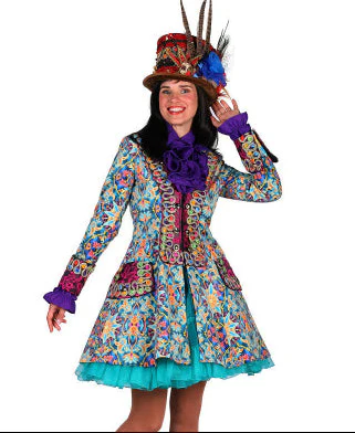 Deze carnavalsjas voor dames combineert een elegante pasvorm met een speels, kleurrijk design vol lente- en bloemmotieven. De jas is zeer fraai getailleerd.