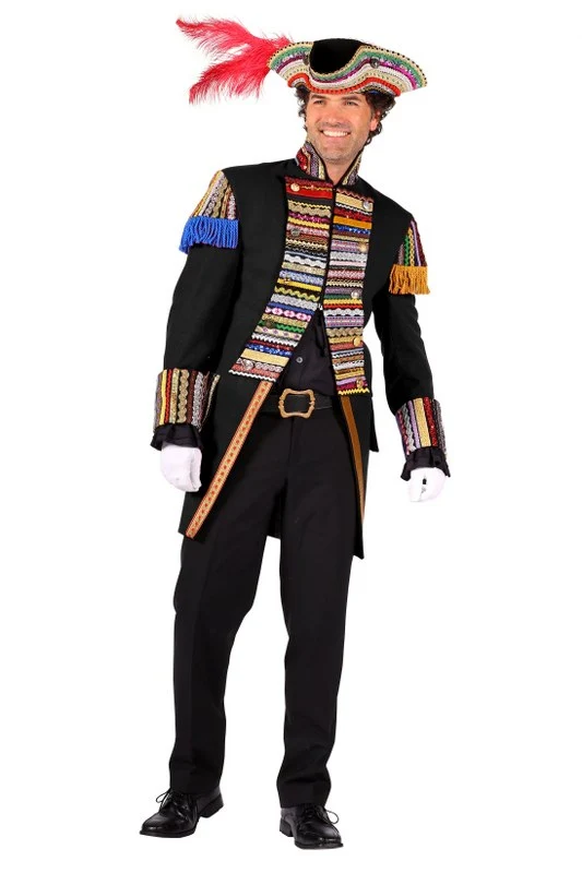 Het leuke en unieke van deze carnavalsjas voor heren is het feit dat de jassen allemaal verschillend zijn, van elke Ribbon Chaos jas is er maar één gemaakt. Hoe dat nu kan? De galon op elke jas heeft zijn eigen patroon. De basis is hetzelfde maar voor elke jas is ander band gebruikt langs de sluiting, de boorden en bij de schouders. Schaf je dus een Ribbon Chaos jas aan, dan weet je zeker dat er niet eenzelfde jas rondloopt. De jas is volledig gevoerd en heeft een erg luxe look, een geweldige jas om het carnaval in te vieren. Deze jassen zijn ook in damesuitvoering.