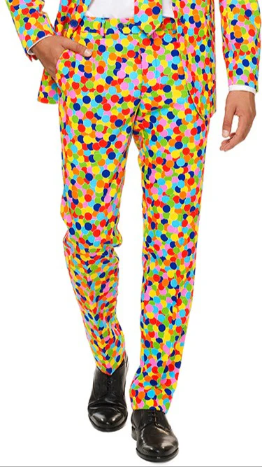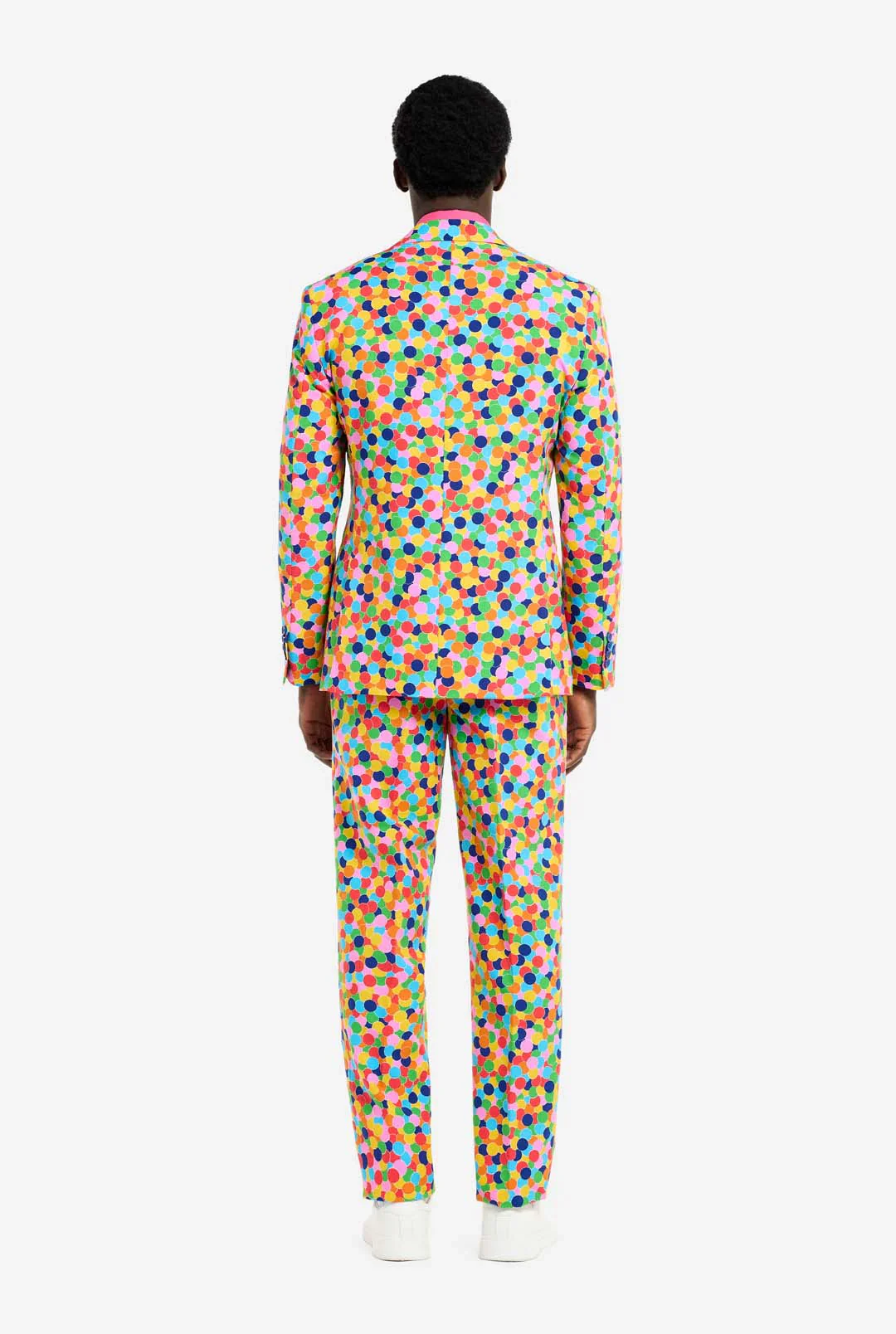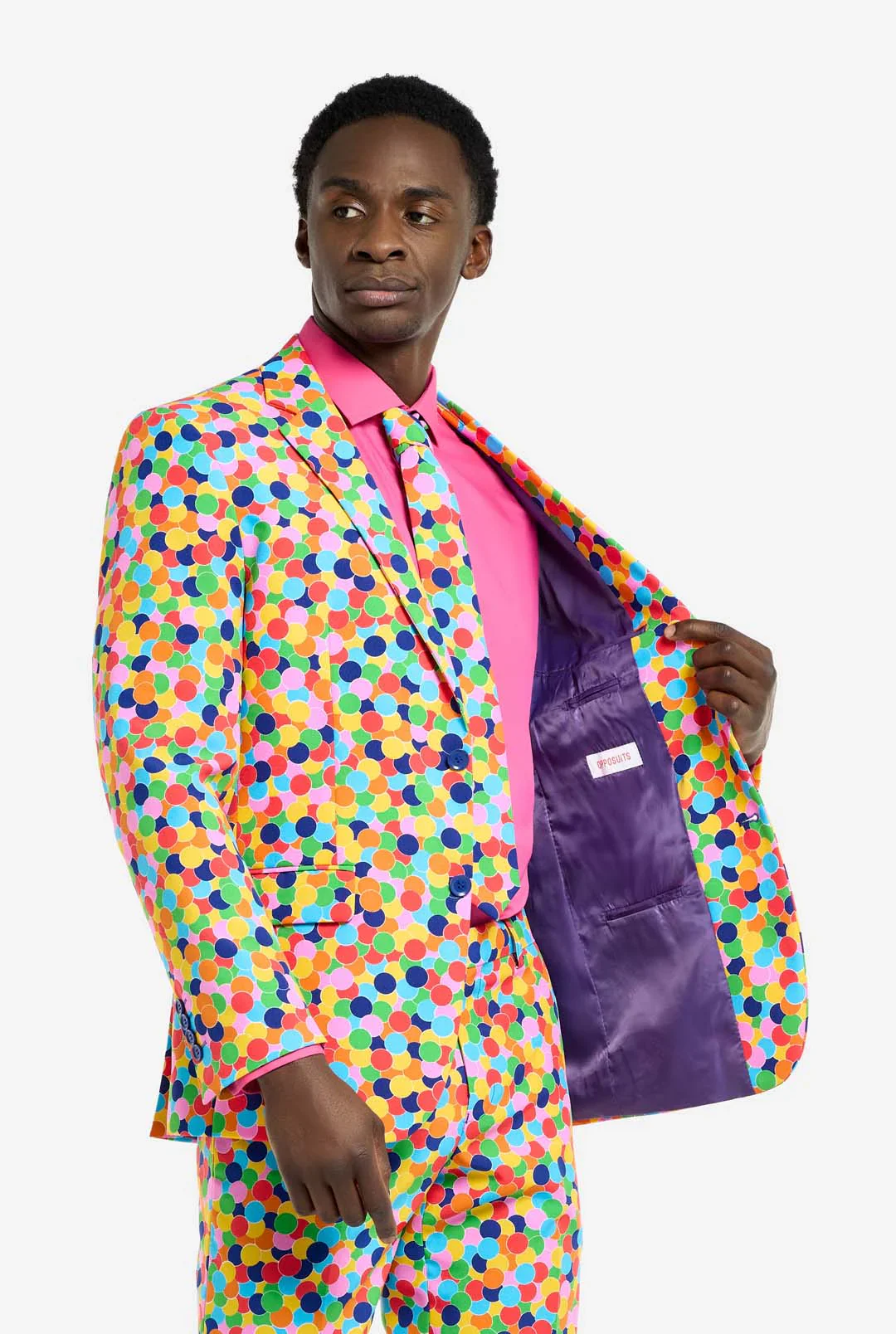 Het eerste wat opvalt aan de Confetteroni Opposuit is natuurlijk het opvallende confetti-ontwerp. Dit maakt het kostuum perfect voor feesten, carnaval, of andere vrolijke gelegenheden. Het gebruik van felle kleuren en contrasterende patronen zorgt ervoor dat je er echt uitspringt in de menigte.