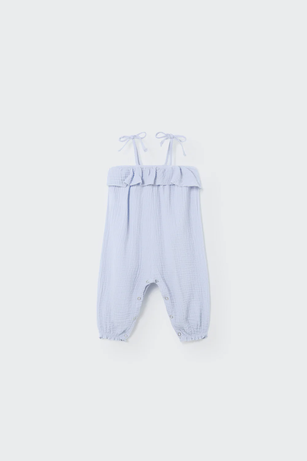 Laat de schattigheid los met onze jumpsuit voor babymeisjes! Gemaakt van pluizig, licht katoenen gaas, biedt deze schattige outfit de hele dag comfort voor je kleine prinses. Met lange pijpen en drukknoopjes langs de zijkanten is luier verschonen een fluitje van een cent, zodat je meer tijd kunt besteden aan samen giechelen! De charmante volant bij de hals voegt een extra vleugje eigenzinnigheid toe, terwijl de natuurlijk gerimpelde textuur het een moeiteloos chique uitstraling geeft. En het beste van alles? De niet-strijkbare stof betekent minder gedoe voor jou en meer speeltijd voor haar. Maak je klaar om in stijl te twirlen met deze must-have jumpsuit!