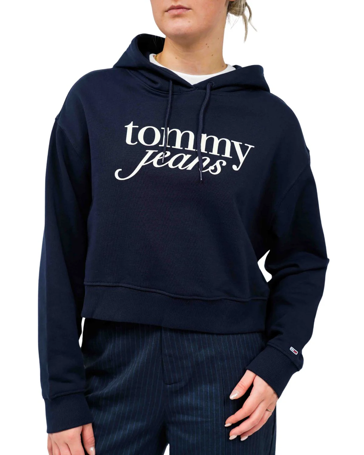 Voeg een vleugje stijl toe aan je garderobe met deze cropped hoodie van Tommy Jeans. De diepe navy kleur en het iconische logo op de borst maken het een veelzijdig stuk dat moeiteloos te combineren is. Perfect voor casual dagen of een ontspannen avondje uit. Geniet van het comfort van zacht katoen en polyester, waardoor je de hele dag fris blijft. Een must-have voor elke modeliefhebber die op zoek is naar tijdloze stijl en comfort.