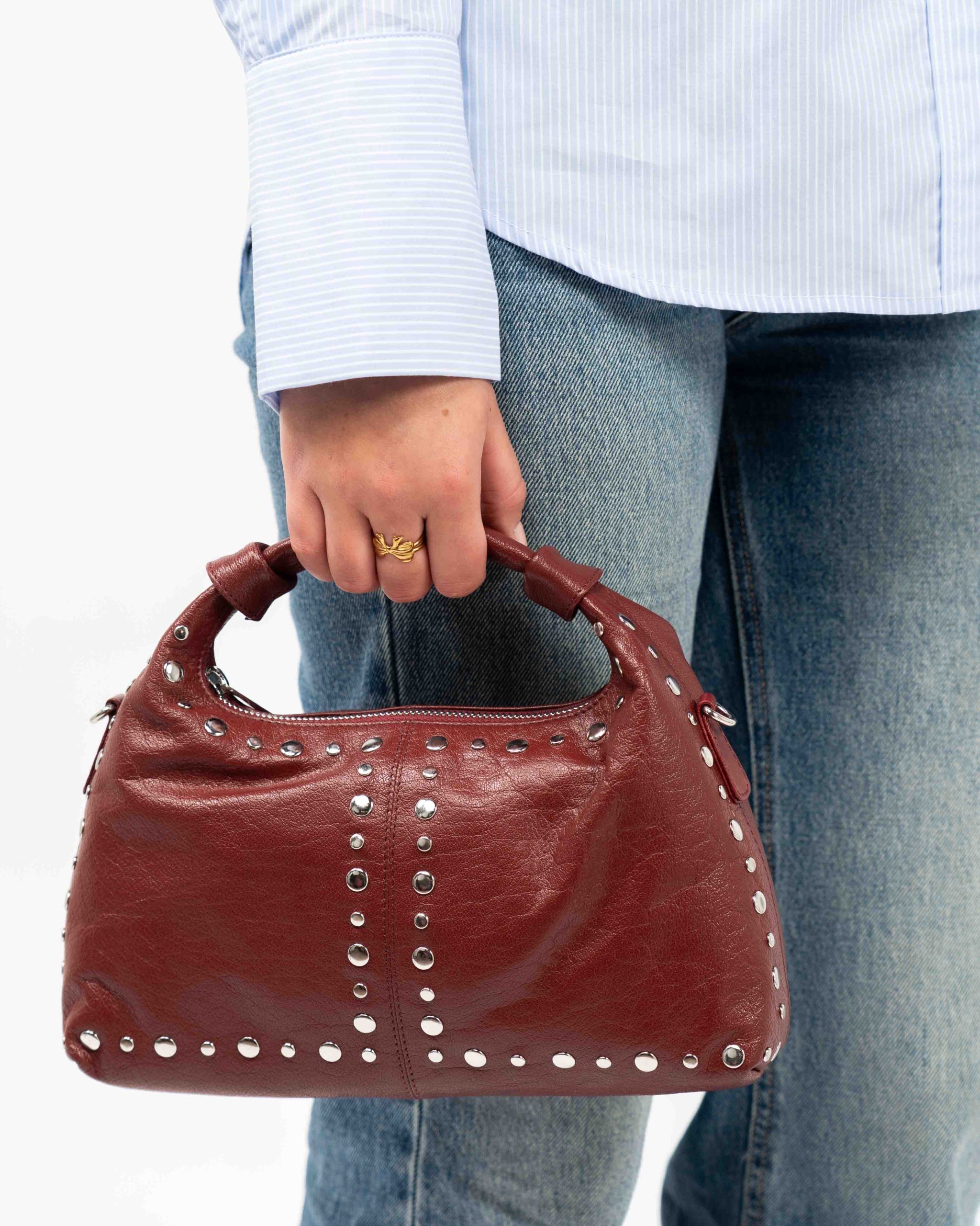 Stijlvol en praktisch, de Dandy Studs Mountain Maroon van Nunoo is een crossbody tas die iedere outfit een luxe uitstraling geeft. De prachtige bordeauxrode kleur en het verfijnde ontwerp met studs maken deze tas niet alleen elegant, maar ook een echt statement piece. Of je nu naar je werk gaat of een avondje uit, deze tas is jouw perfecte metgezel.