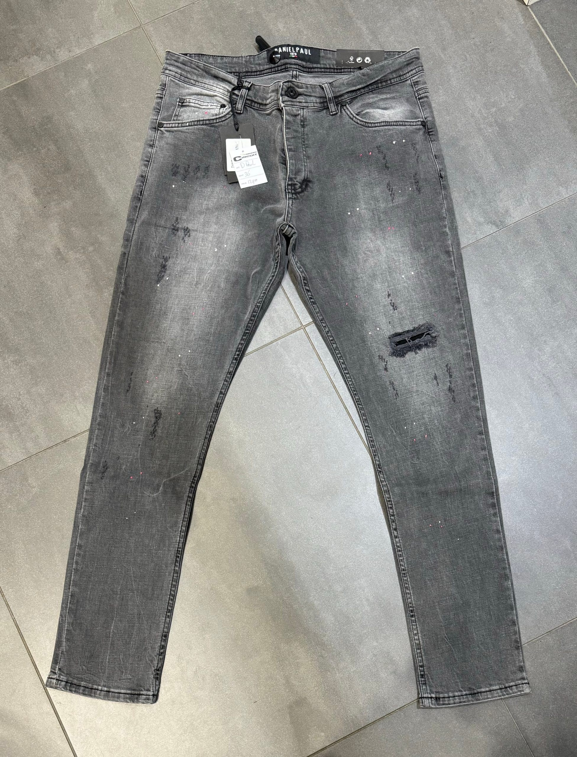 Daniel Paul Jeans grijs met verf spetters en stretch, model slim fit en valt normaal.