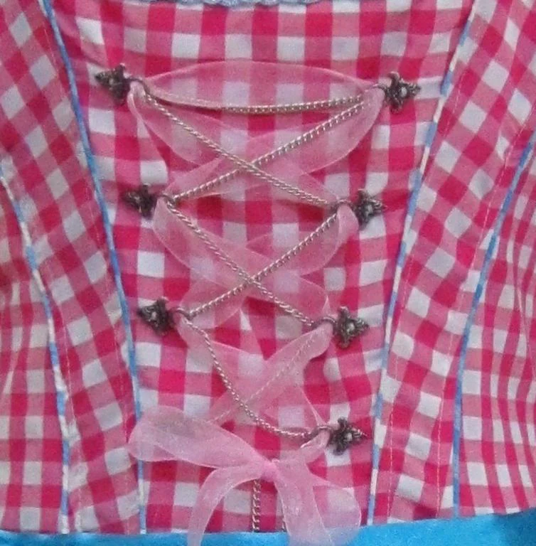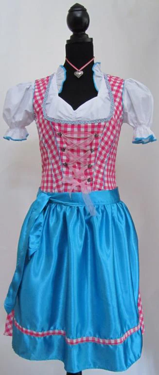 Dirndl blauw-wit-roze, midi model, 3-delig. De dirndle bestaat uit de jurk, blouse en het schort. Het is een luxe uitvoering voor betaalbare prijs. Een heel mooi product waarmee je uitstekend voor de dag komt op elk oktoberfeest. Jurk valt erg klein uit, maatje groter bestellen is verstandig.