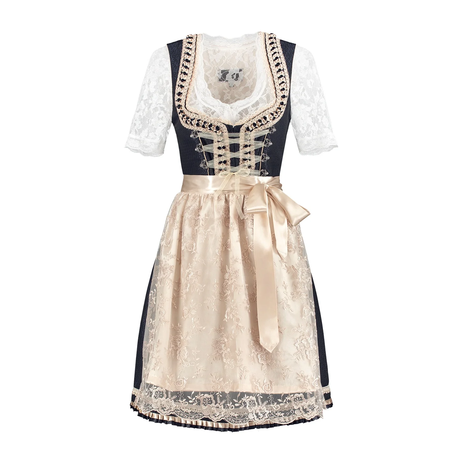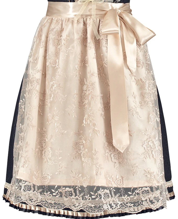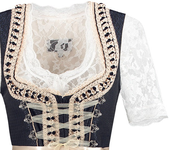 Dirndl Luxe Donkerblauw Creme met Satijn is een zeer fraaie jurk met een geweldige luxe uitstraling. De jurk bevat een los schort