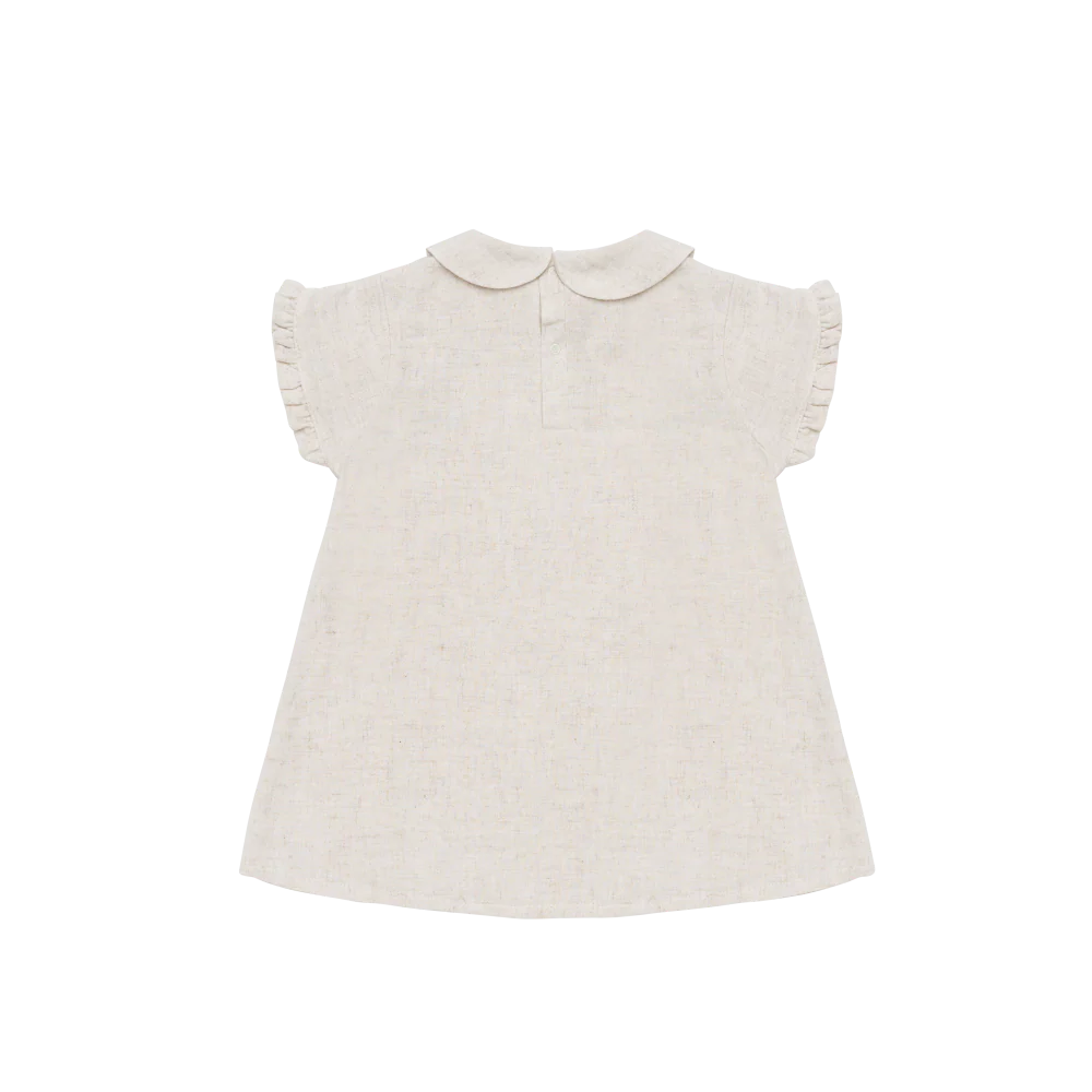 Het ontwerp van de Flien Dress kenmerkt zich door een luchtig silhouet en subtiele details die de jurk een verfijnde uitstraling geven. De zachte Birch Melange-kleur zorgt voor een rustige, natuurlijke look die mooi past binnen een minimalistische en moderne kindergarderobe. De afwerking is zorgvuldig uitgevoerd en geeft de jurk een luxe uitstraling zonder overdreven te zijn.