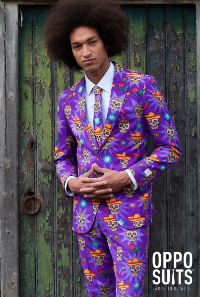 Het El Muerto Kostuum staat vol met kleurige afbeeldingen met een Zuid Amerikaans tintje. De vrolijke kleuren in combinatie met doodshoofden maakt het kostuum geschikt voor meerdere doeleinden. De zeer fraaie doos bevat een colbert, pantalon en stropdas