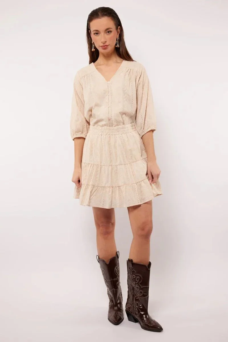 Voor een complete en elegante outfit combineer je de Athene Skirt met de Amari blouse, die dezelfde verfijnde broderiedetails en luchtige uitstraling heeft. Samen vormen ze een chique co-ord set die perfect is voor zowel casual als formele gelegenheden. Draag de set met cowboylaarzen voor een bohemian touch of kies voor sandalen en subtiele sieraden voor een zomerse, romantische look.