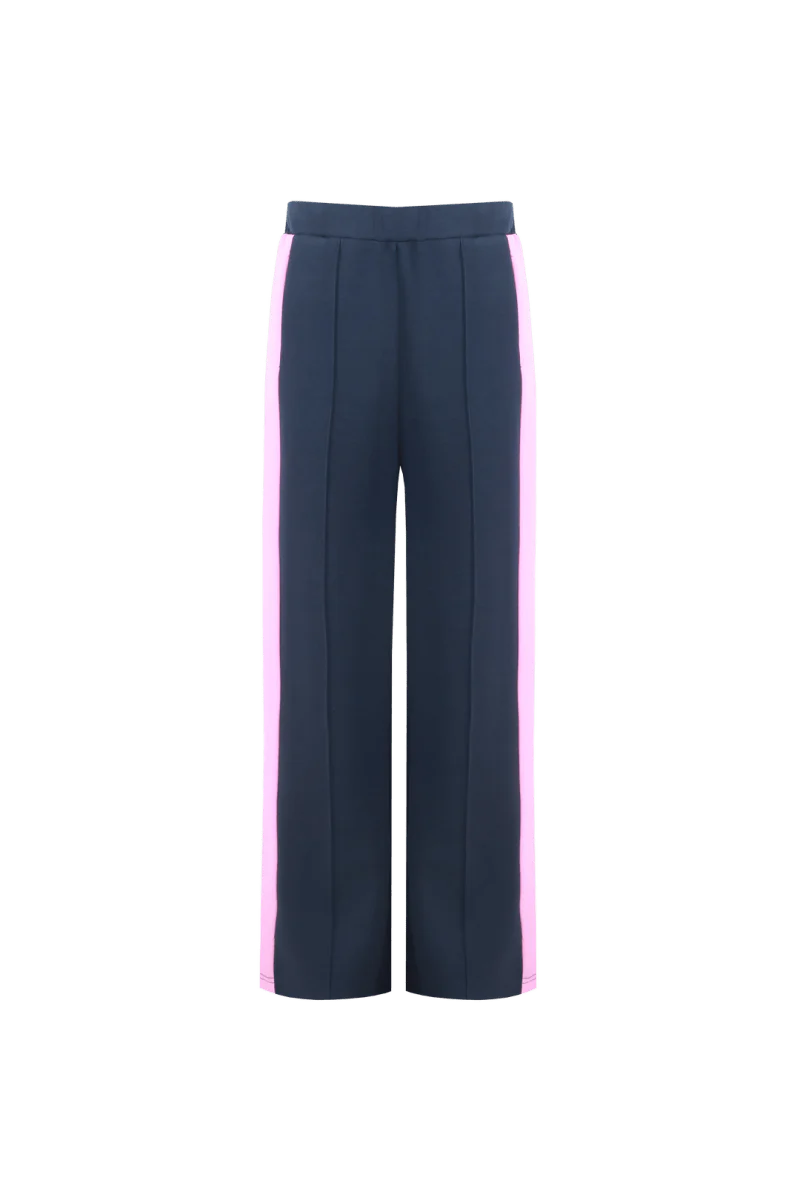 Zoek je nog een comfortabele, maar stijlvolle broek om de winter door te komen? dan is de Ewan pants van Fluresk dè broek voor jou! Deze dames broek is gemaakt in een donkerblauwe kleur met een roze streep aan de zijkant. De elastische tailleband en de joggingsstof maken hem super comfortabel.