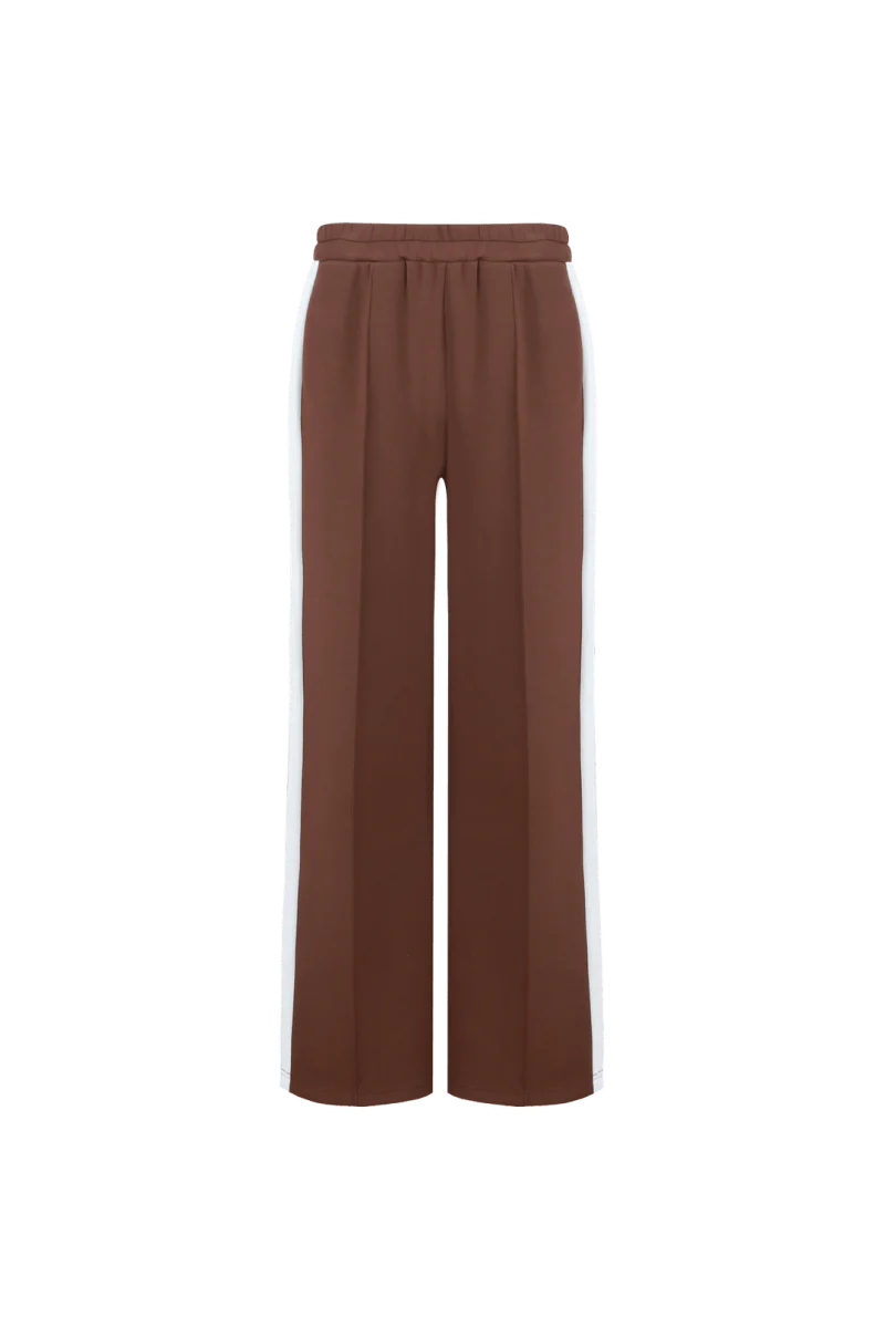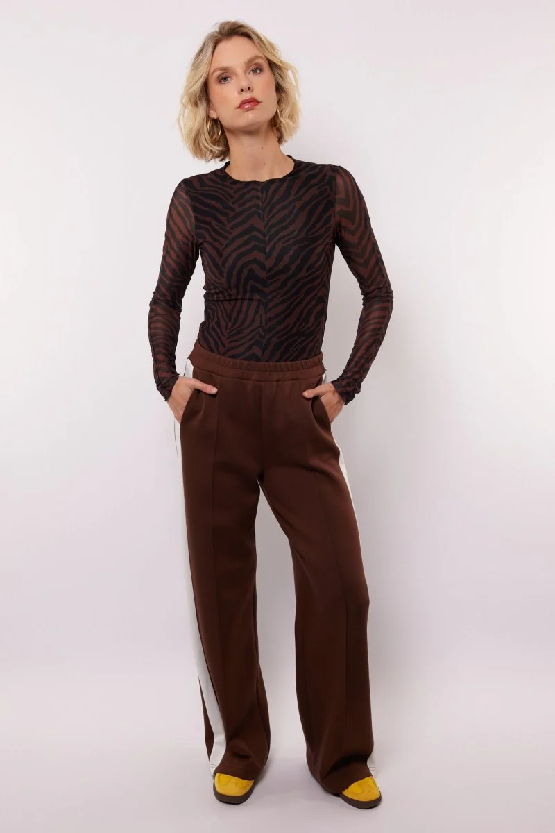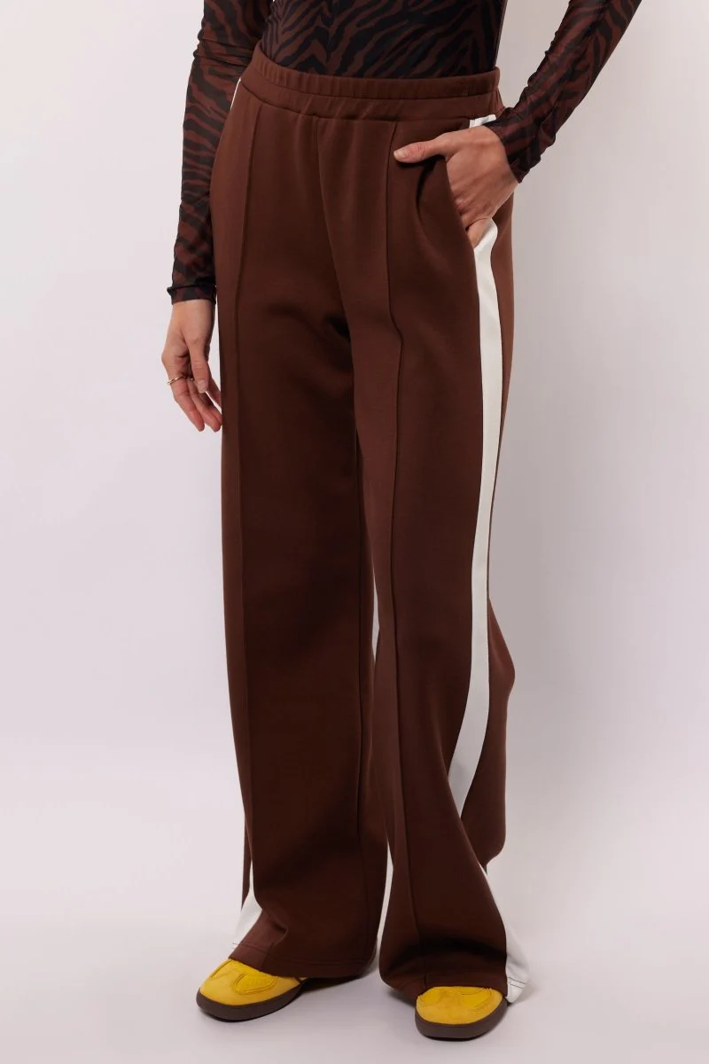 Een comfortabele broek, die er tegelijkertijd helemaal stylisch uit ziet. Daar zeggen we bij Jo&Co geen nee tegen. De Mairen pants van Fluresk is een bruine broek voor dames met een witte verticale streep aan de zijkant. Hij is gemaakt van een zachte stof, wat deze dames broek heerlijk draagbaar maakt.