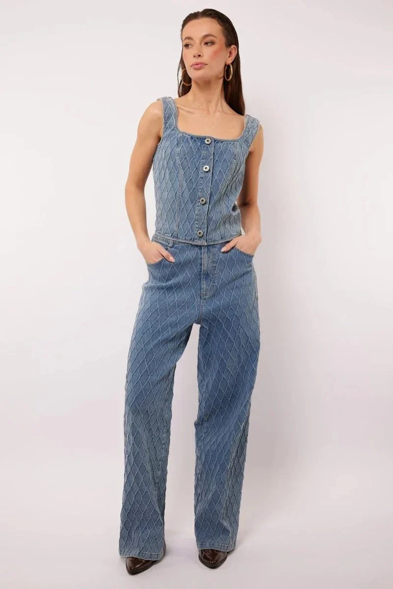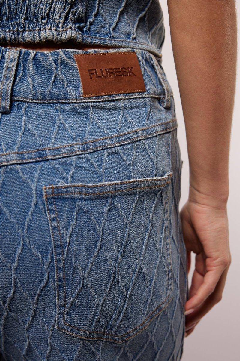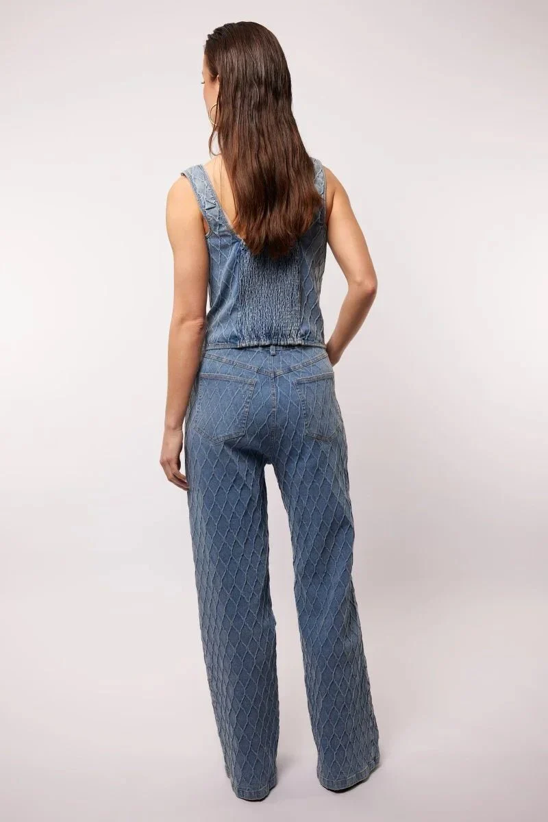Level je denim game up met onze Raine pants van Fluresk! Deze high waisted broek met wijde pijpen en ingeweven diamond structuur is dé perfecte mix van stijlvol en stoer. De lichte wassing geeft een vintage look, terwijl het unieke patroon zorgt voor een opvallende maat classy uitstraling.