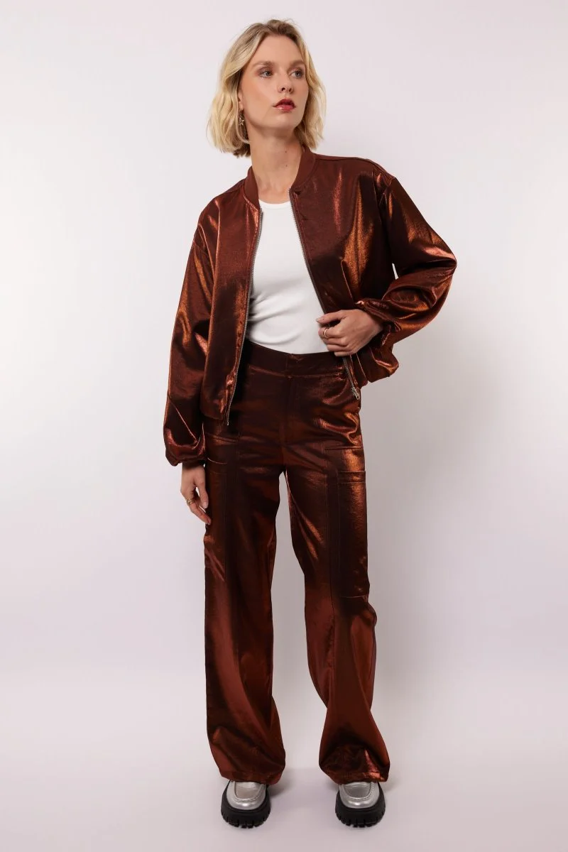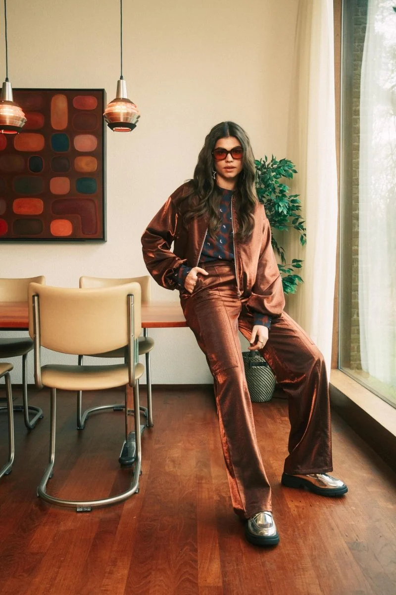 Het Thirza jacket heeft een mooie bruine/koper-achtige kleur, waardoor hij super leuk is om te combineren met een jeans. Wil je lekker all-out gaan? Dan is dit bomber jacket geweldig om te combineren met de Fiora pants.