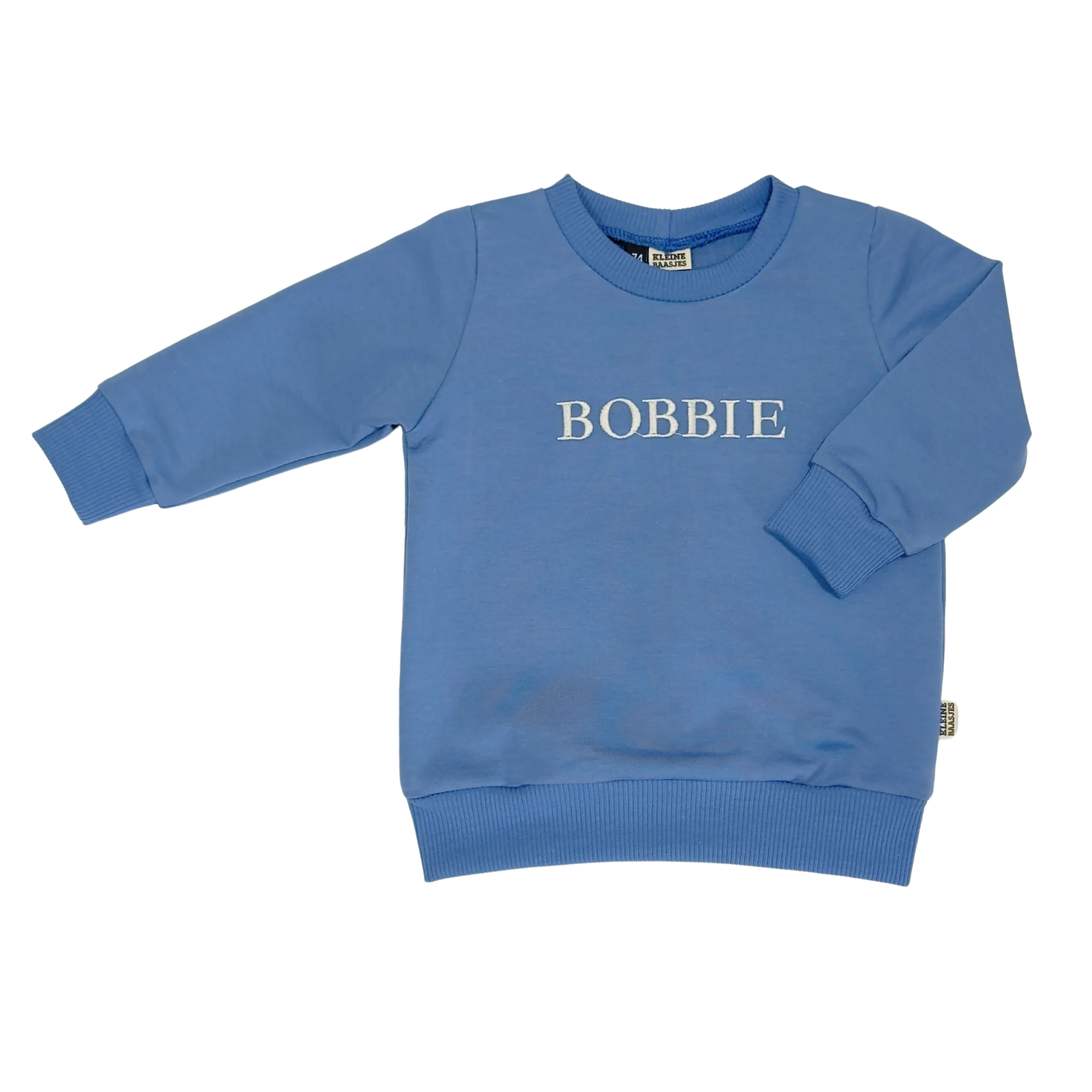 Uni geborduurde sweater van zeer zacht sweat katoen in de kleur blauw met je eigen naam in creme kleurige letters.