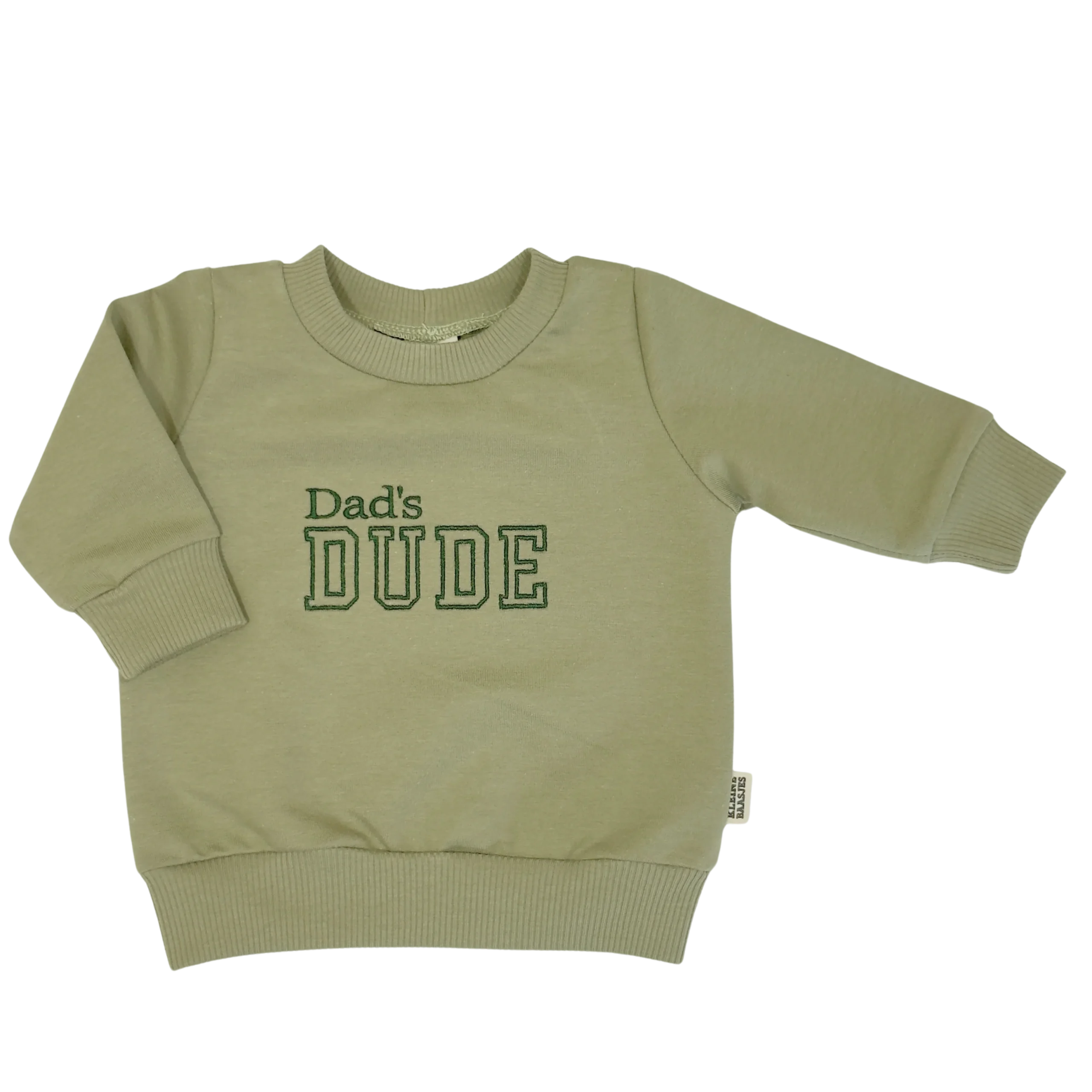 Uni geborduurde sweater voor jongens van zeer zacht sweat katoen in de kleur groen met Dad’s Dude in groene of licht groene letters erop geborduurd.