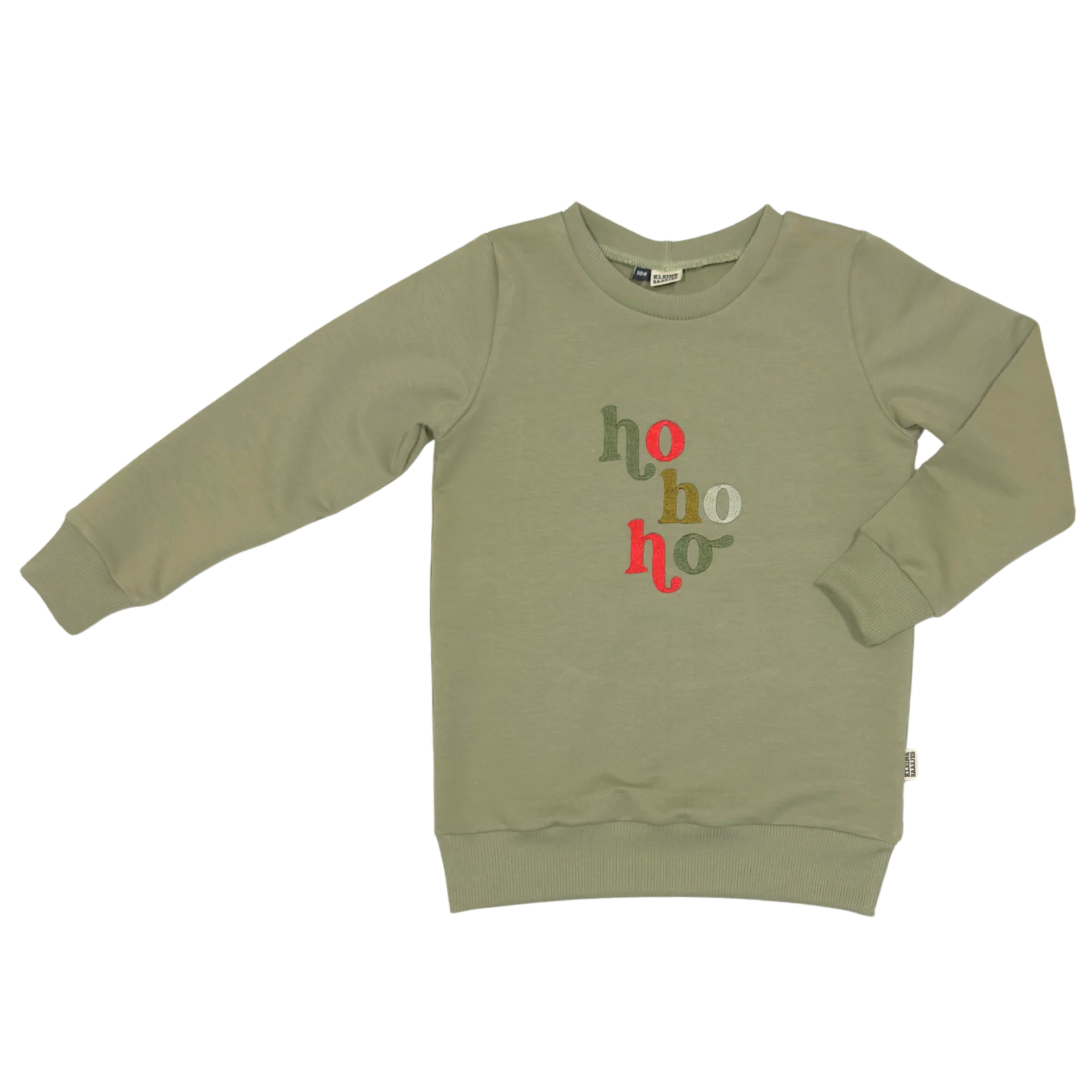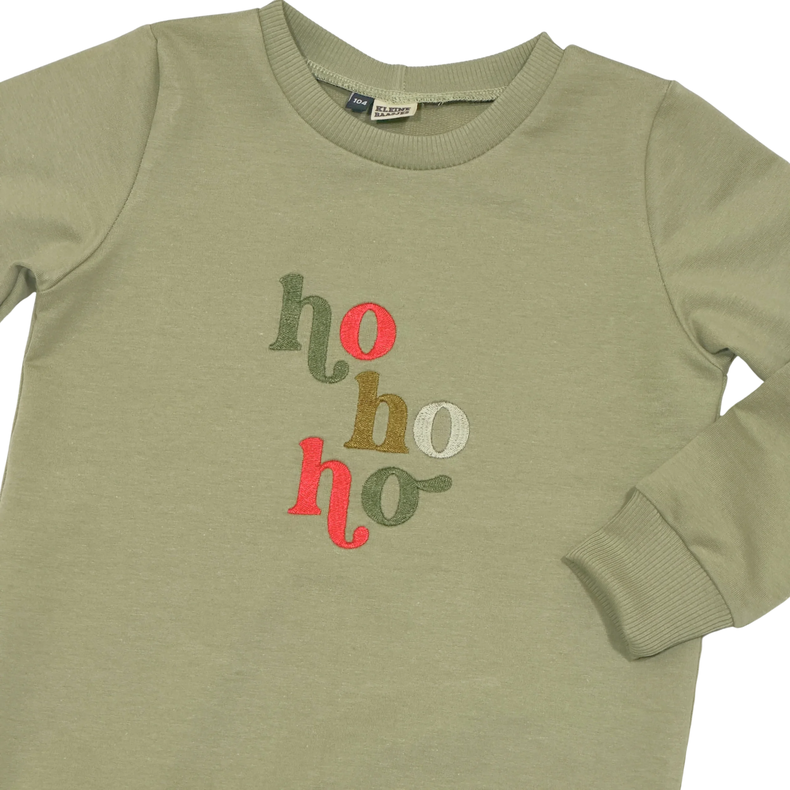 Uni kerstsweater voor de hele familie van zeer zacht sweat katoen in de kleur groen met de tekst ‘Hohoho’ erop geborduurd.