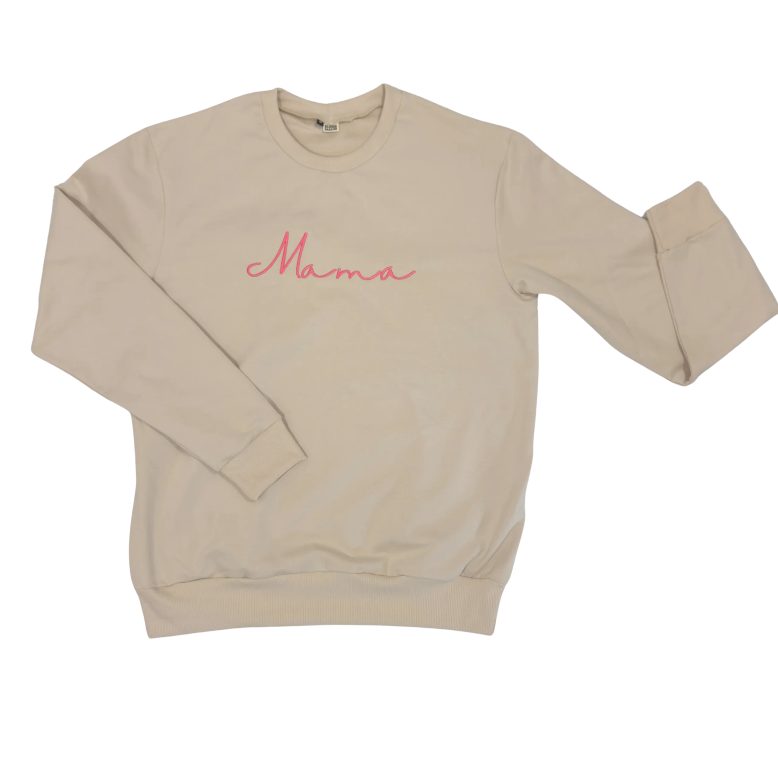 Op deze beige sweater voor dames staat het woord MAMA in de kleur framboos roze in een handgeschreven lettertype.