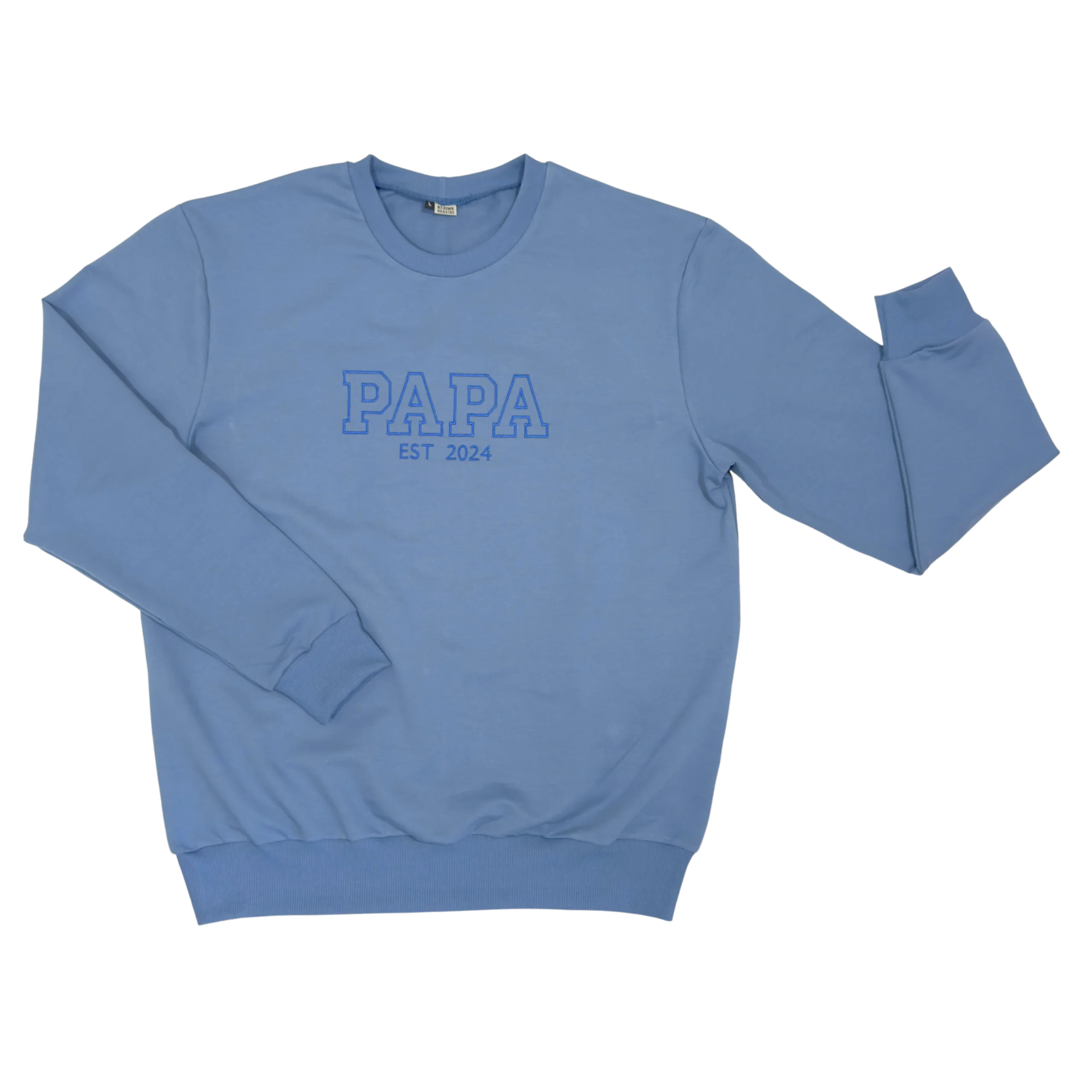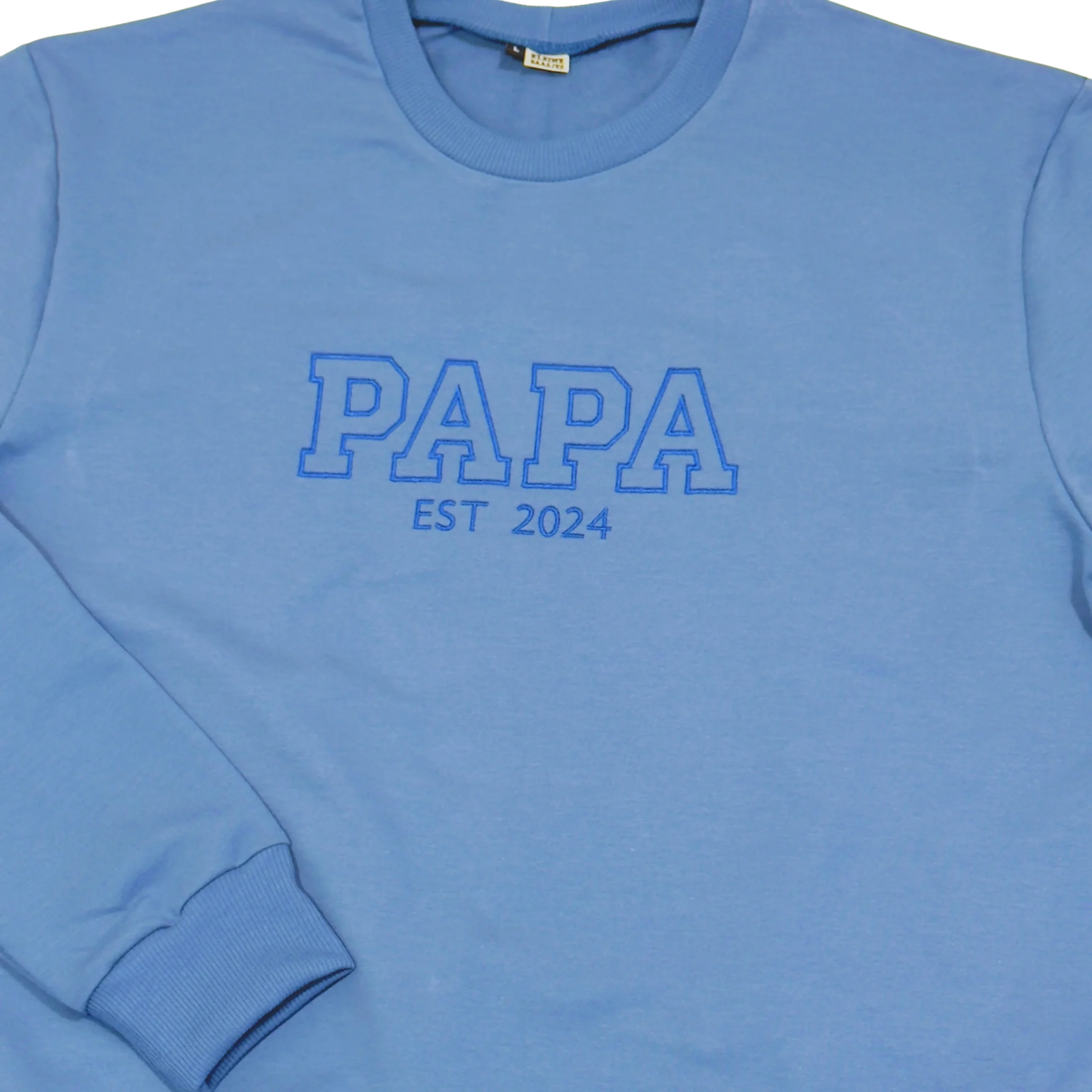 Heren sweater van zeer zacht sweat katoen in de kleur blauw, met ‘PAPA est -jaartal-‘ erop geborduurd, in een ruimvallend model. Deze sweater is voor alle mannen die in 2024 of 2025 papa worden of zijn geworden! Je kunt natuurlijk zelf je jaartal doorgeven in het keuzevak voor het jaar waarin jij papa bent geworden.