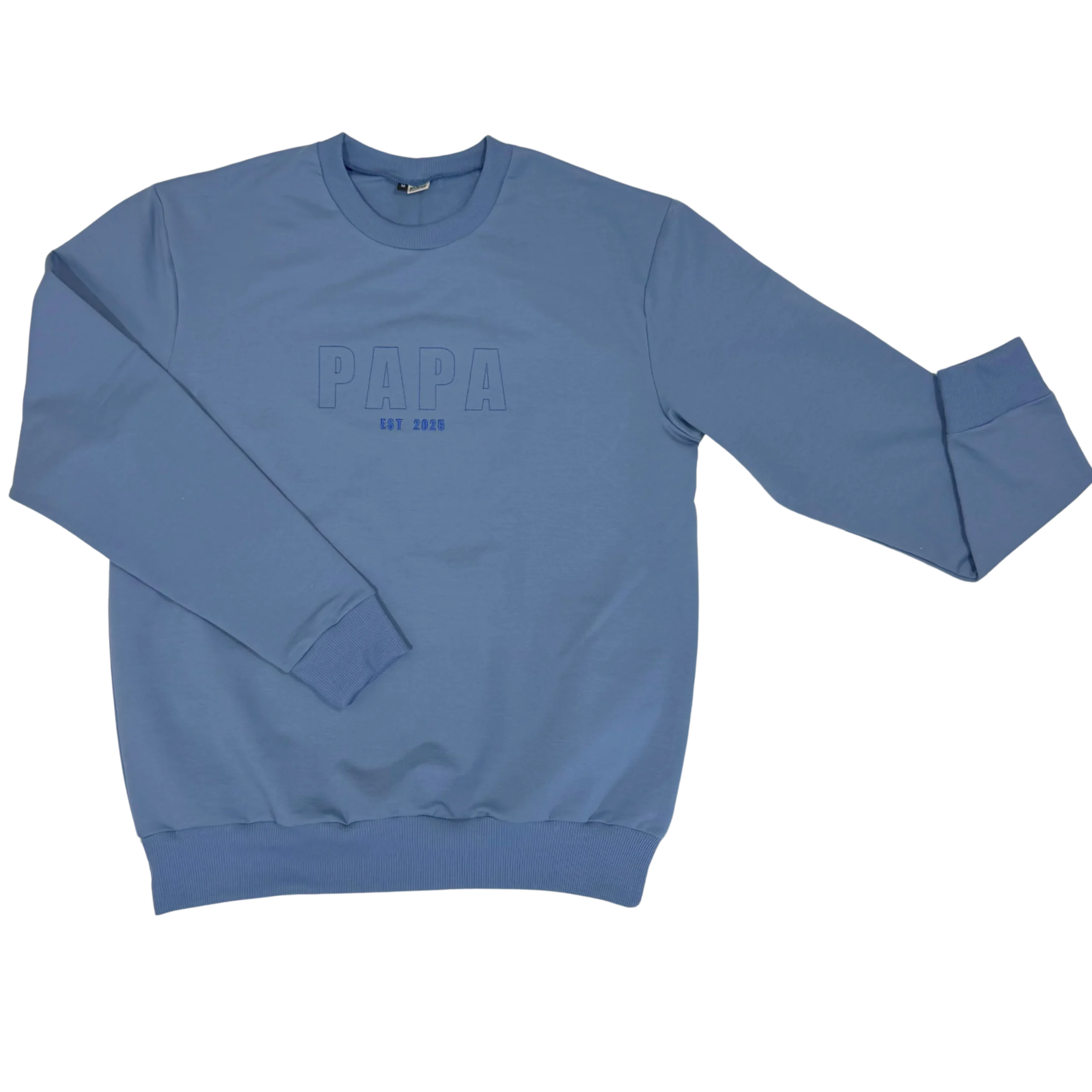 Heren sweater van zeer zacht sweat katoen in de kleur blauw, met ‘PAPA est 2025’ erop geborduurd, in een ruimvallend model. Deze sweater is voor alle mannen die in 2025 papa worden of zijn geworden! Maar je kunt zelf je jaartal doorgeven in het keuzevak voor het jaar waarin jij papa bent geworden.