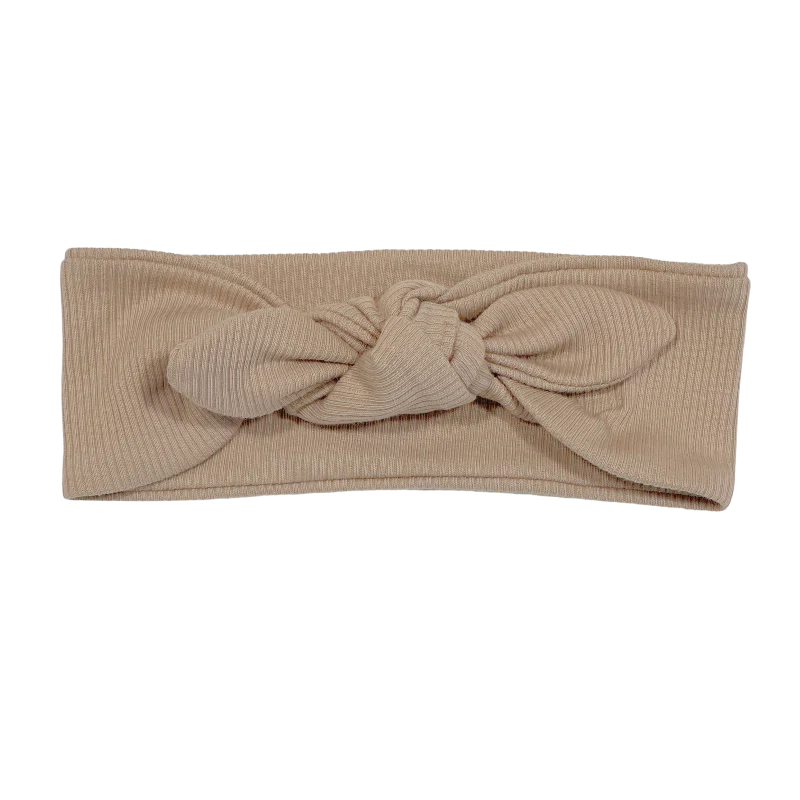 Geknoopte haarband in de kleur beige. Draag deze haarband in combinatie met een jumpsuit, jurkje of broekje van dezelfde of bijpassende print/kleur om de look van je kleintje helemaal af te maken!