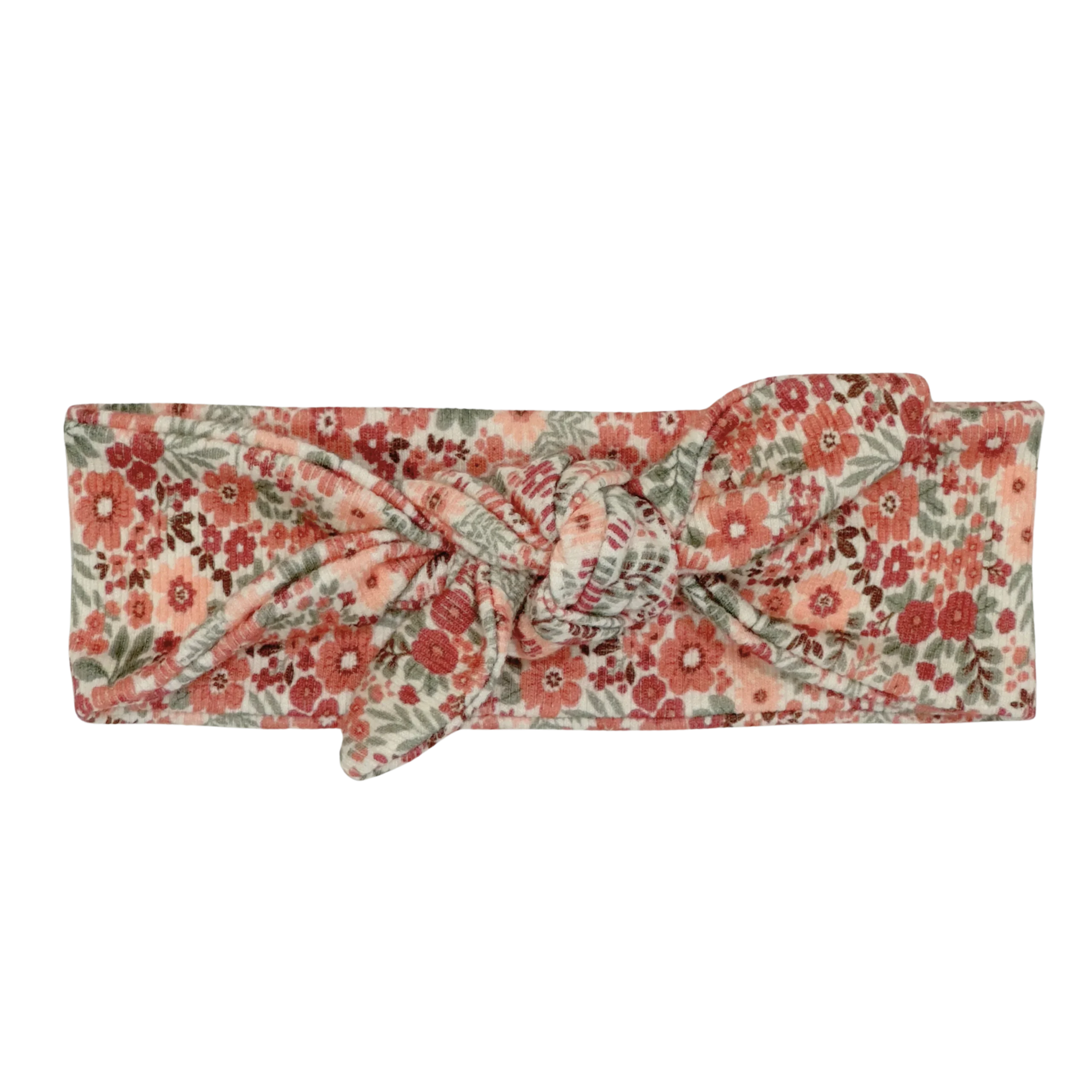 Geknoopte haarband met een lieve bloemen print in de kleuren groen, roze en bruin. Draag deze haarband in combinatie met een jumpsuit, jurkje of broekje van dezelfde of bijpassende print/kleur om de look van je kleintje helemaal af te maken!