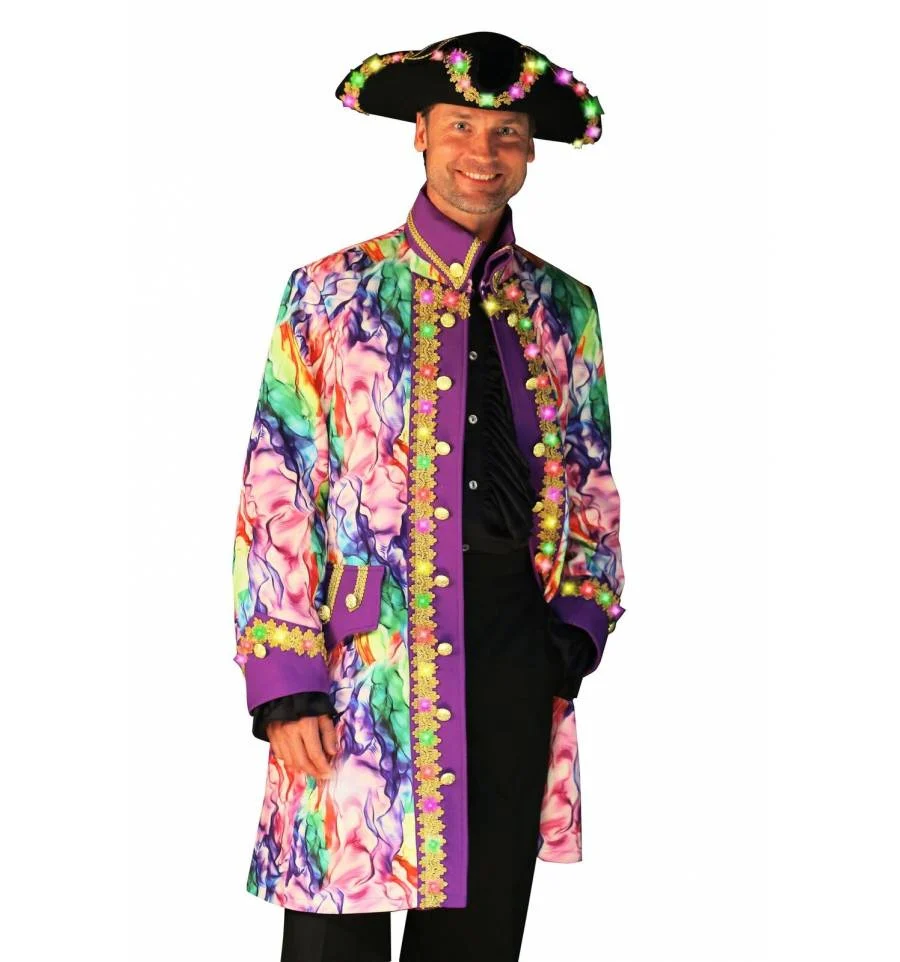 Herenjas Kronos is super mooie Carnavalsjas om in te shinen, een volledig gevoerde jas met led verlichting in het goudgalon. Het batterijkastje is verwerkt in de jaszak en is los te koppelen om de jas te reinigen. De led verlichting werkt op 3 AA batterijen (niet meegeleverd)