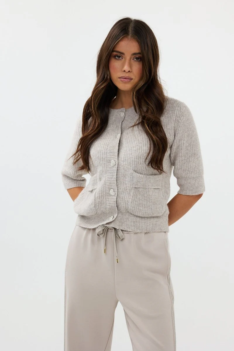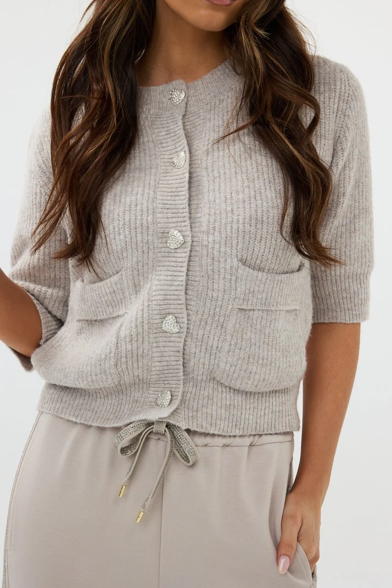 Cuteness overload met de Paris cardigan van HEYB Club! De Paris cardigan is een grijs vestje met halflange mouwen, steekzakken en de knopen van dit dames vestje zijn hartjes met glitters, hoe cute!