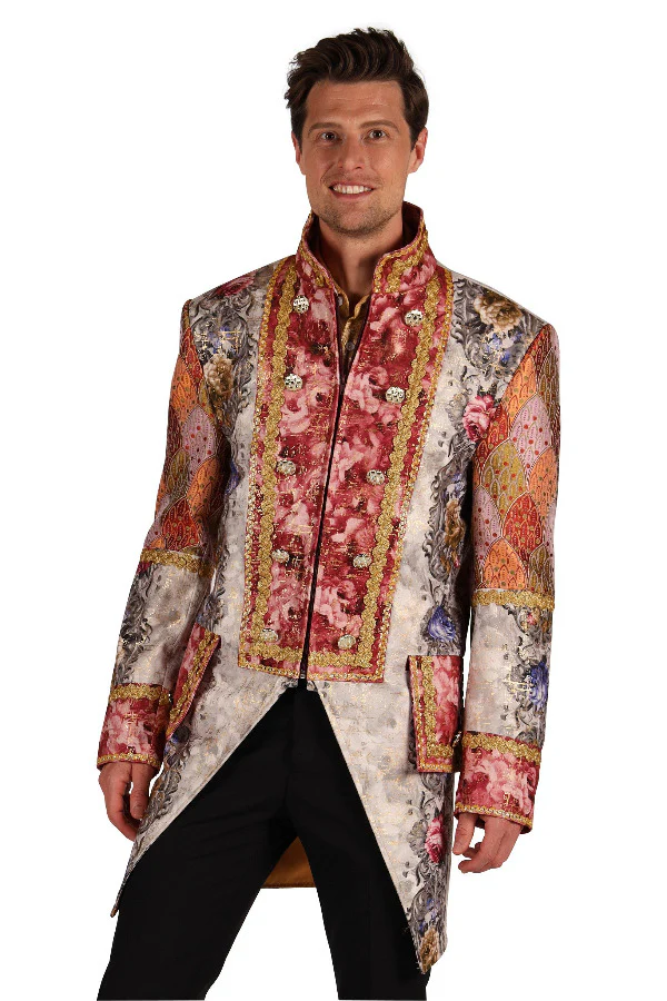 De jas is luxe afgewerkt met decoratieve knopen, een opstaande kraag en elegante details die doen denken aan klassieke hofkostuums. Dankzij de comfortabele pasvorm is de jas prettig om te dragen.