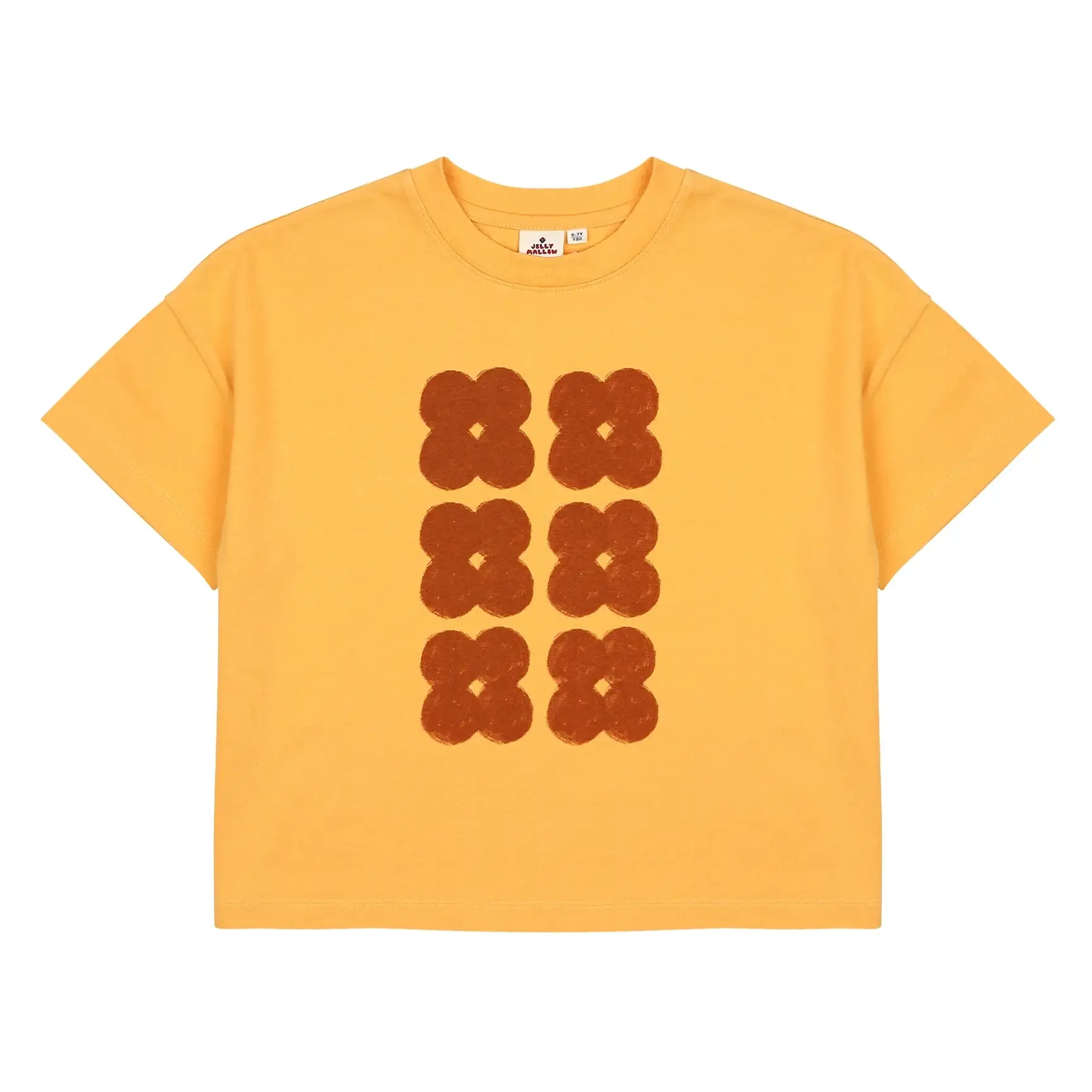Geel kleurig t-shirt van JellyMallow met een clover print. Een katoenen shirt met een ronde hals en korte mouwen.