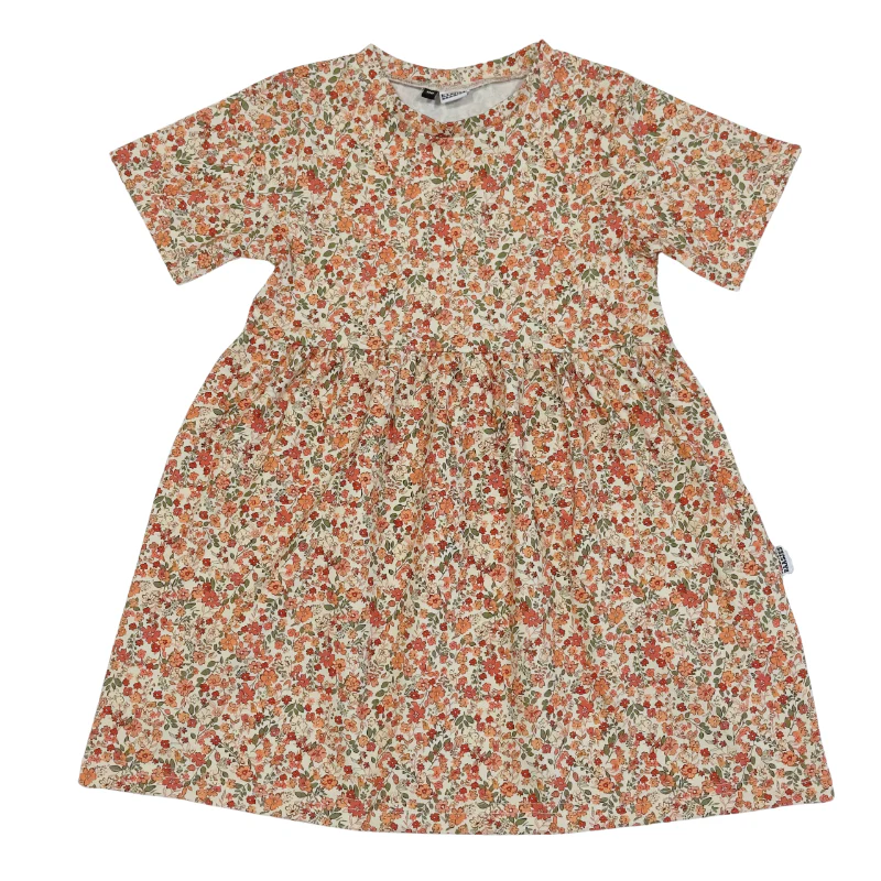 Mooie jurk in een klassiek model met een lief en vrolijk bloemen printje in de kleuren klei roze, groen en licht roze en creme.