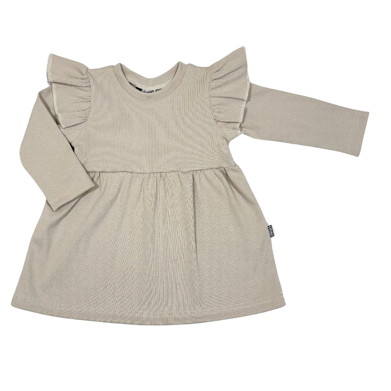 Mooie handgemaakte jurk van zachte rib stof met lange mouw en ruffles in de kleur licht beige.
